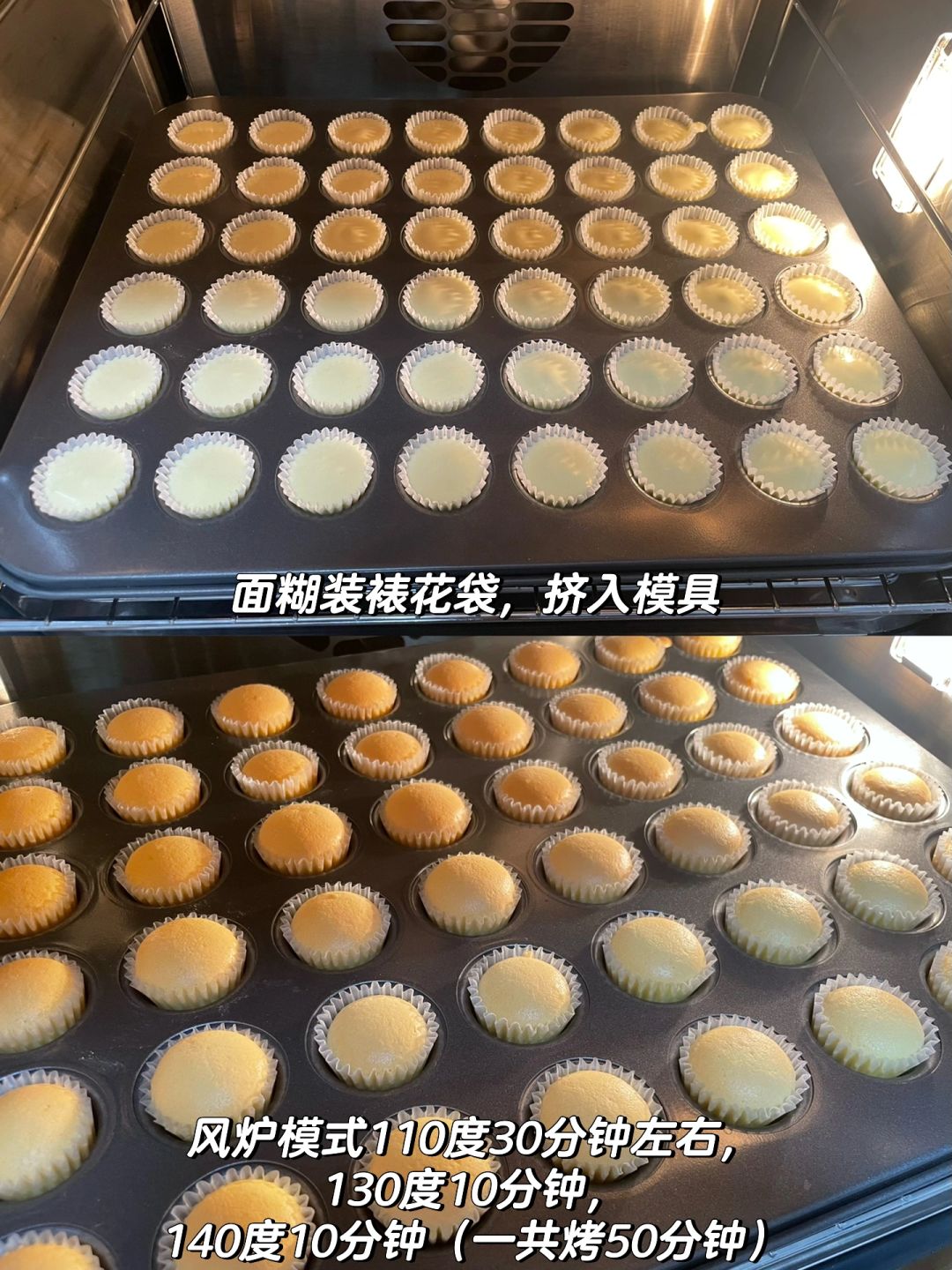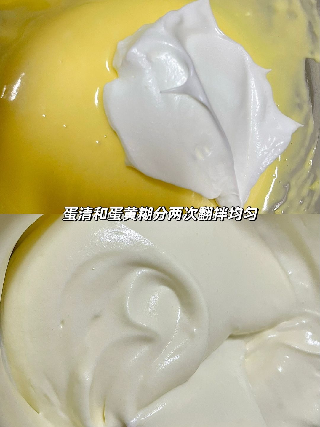 6⃣️蛋清和蛋黄糊分两次翻拌均匀,面糊装裱花袋,挤入模具
