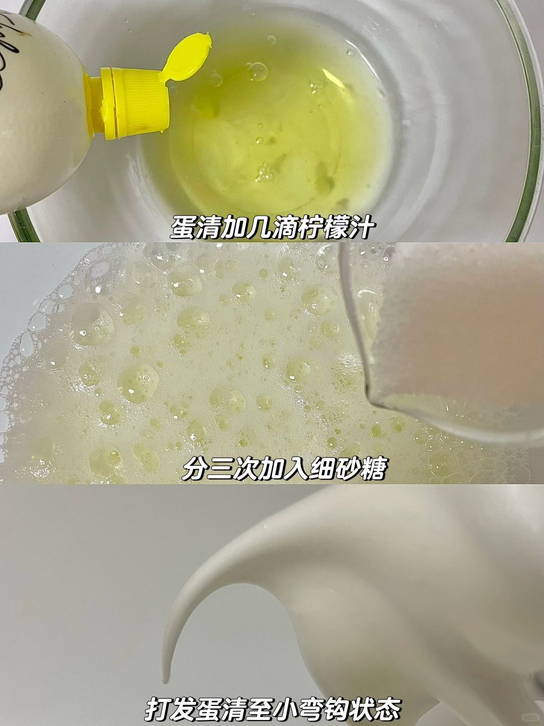 5⃣️蛋清加几滴柠檬汁,分三次加入细砂糖,打发蛋清至小弯钩状态