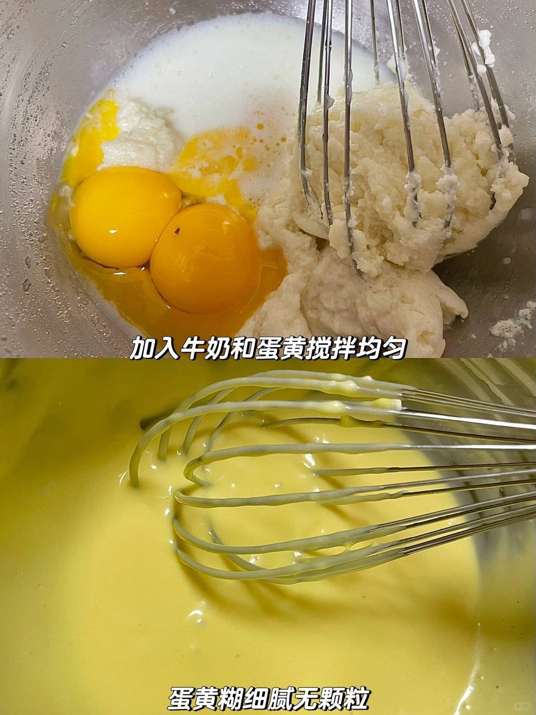 4⃣️加入牛奶和蛋黄搅拌均匀,蛋黄糊细腻无颗粒