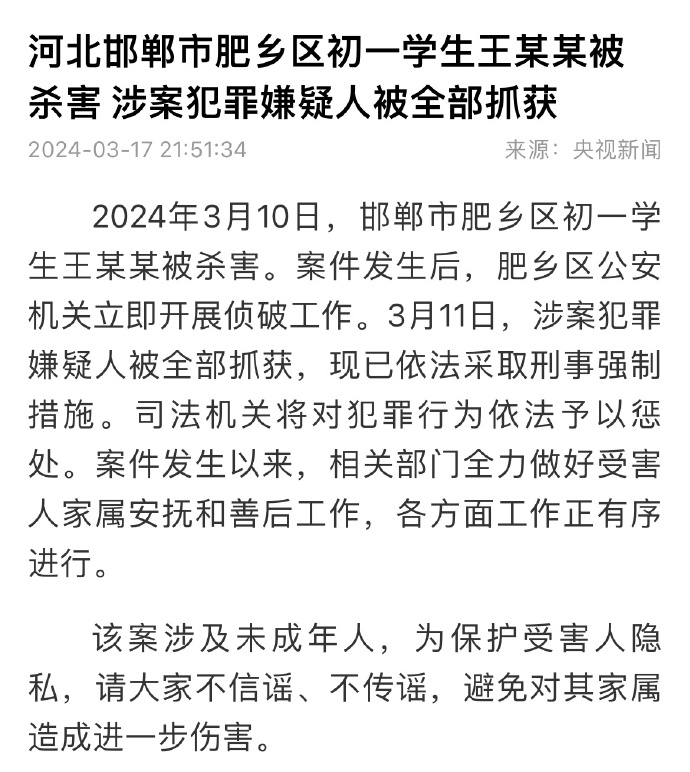 【河北邯郸通报初中生被杀害案】在有关刑事责任年龄方面,我建议: