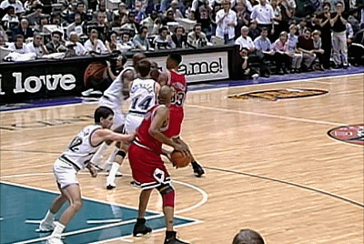 看到了几个经典,乔丹的突破,抢断,摆脱与后仰。斯托克顿的阴损,马龙的杀人肘,库科奇的三分