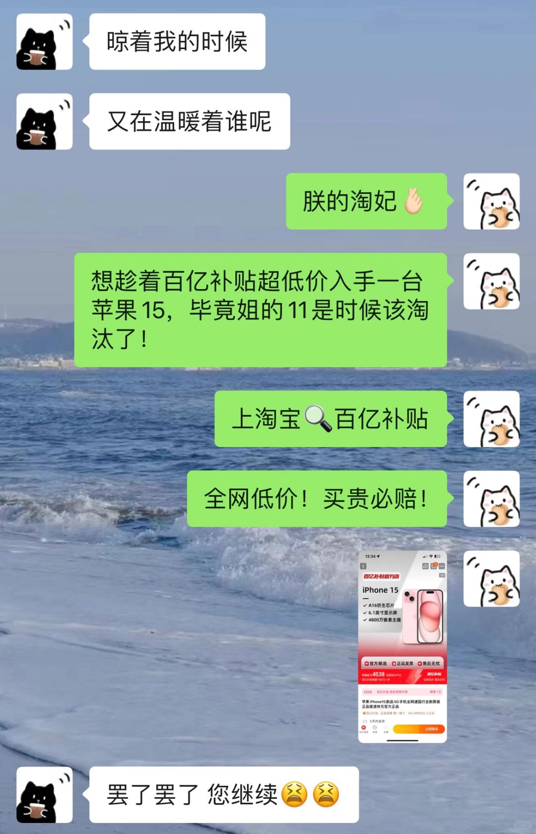 哈哈两个有梗的人聊天太好玩了 聊天就是要发疯啊 不然日子多无趣 趁着淘宝百亿补贴超低价入手台苹果15 补贴后价格才四千多呀 是时候把我的11换掉了!