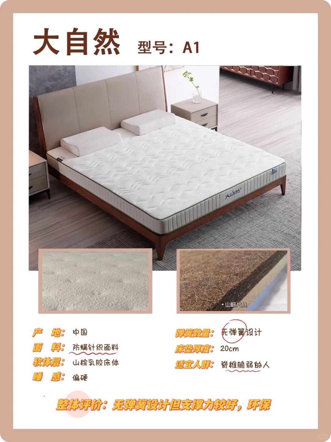 老国货品牌,大自然A1采用防螨针织面料、山棕乳胶床体,虽然无弹簧设计,但支撑力是可以的,睡感偏硬,适合脊椎脆弱的人群。