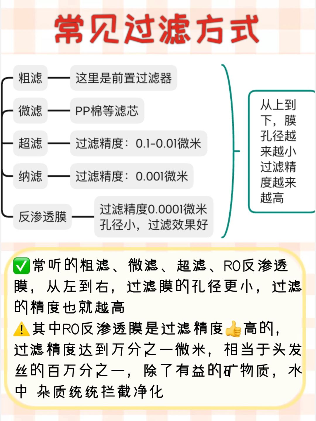 常听的粗滤、微滤、超滤、RO反渗透膜,过滤膜的孔径越小,过滤的精度也就越高
