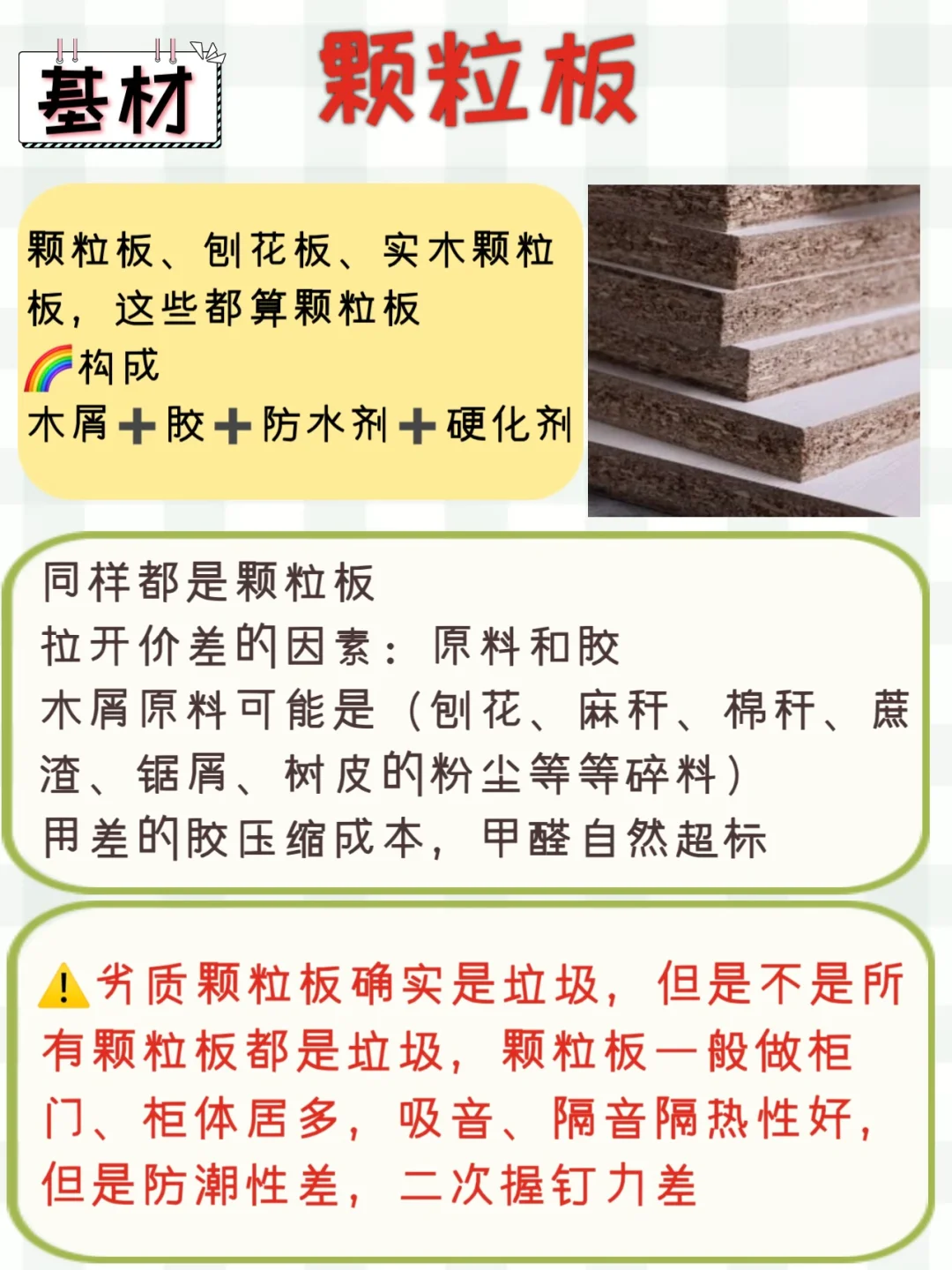 ⚠️劣质颗粒板确实是垃圾,但是不是所有颗粒板都是垃圾,颗粒板一般做柜门、柜体居多,吸音、隔音隔热性好,但是防潮性差,二次握钉力差