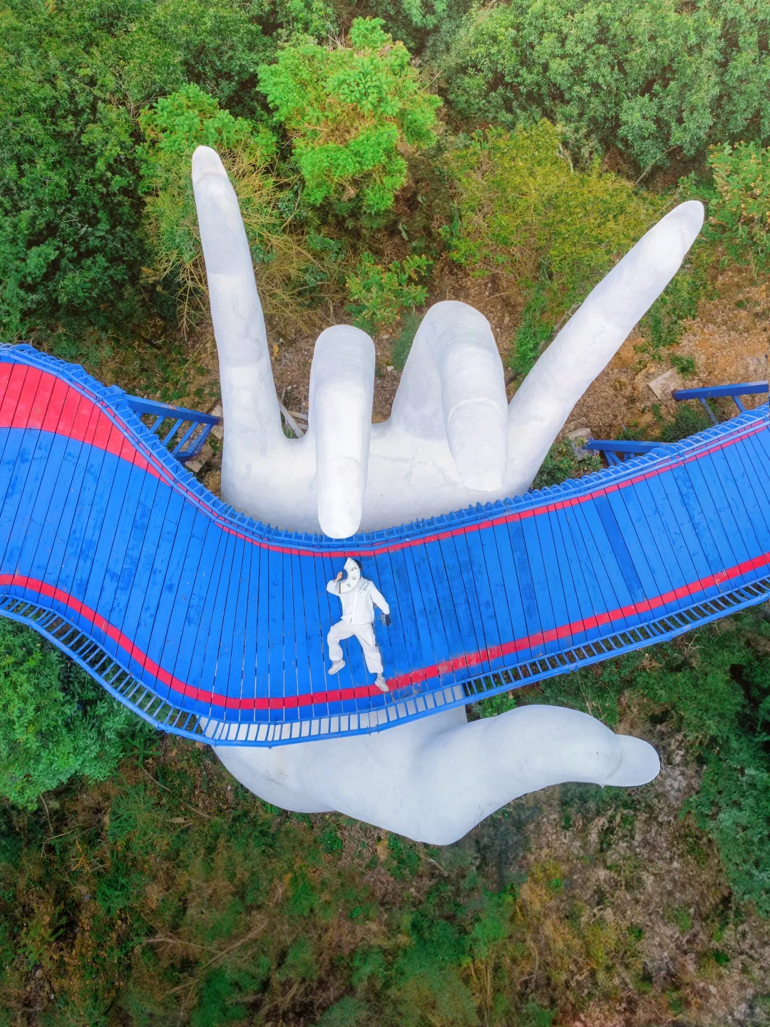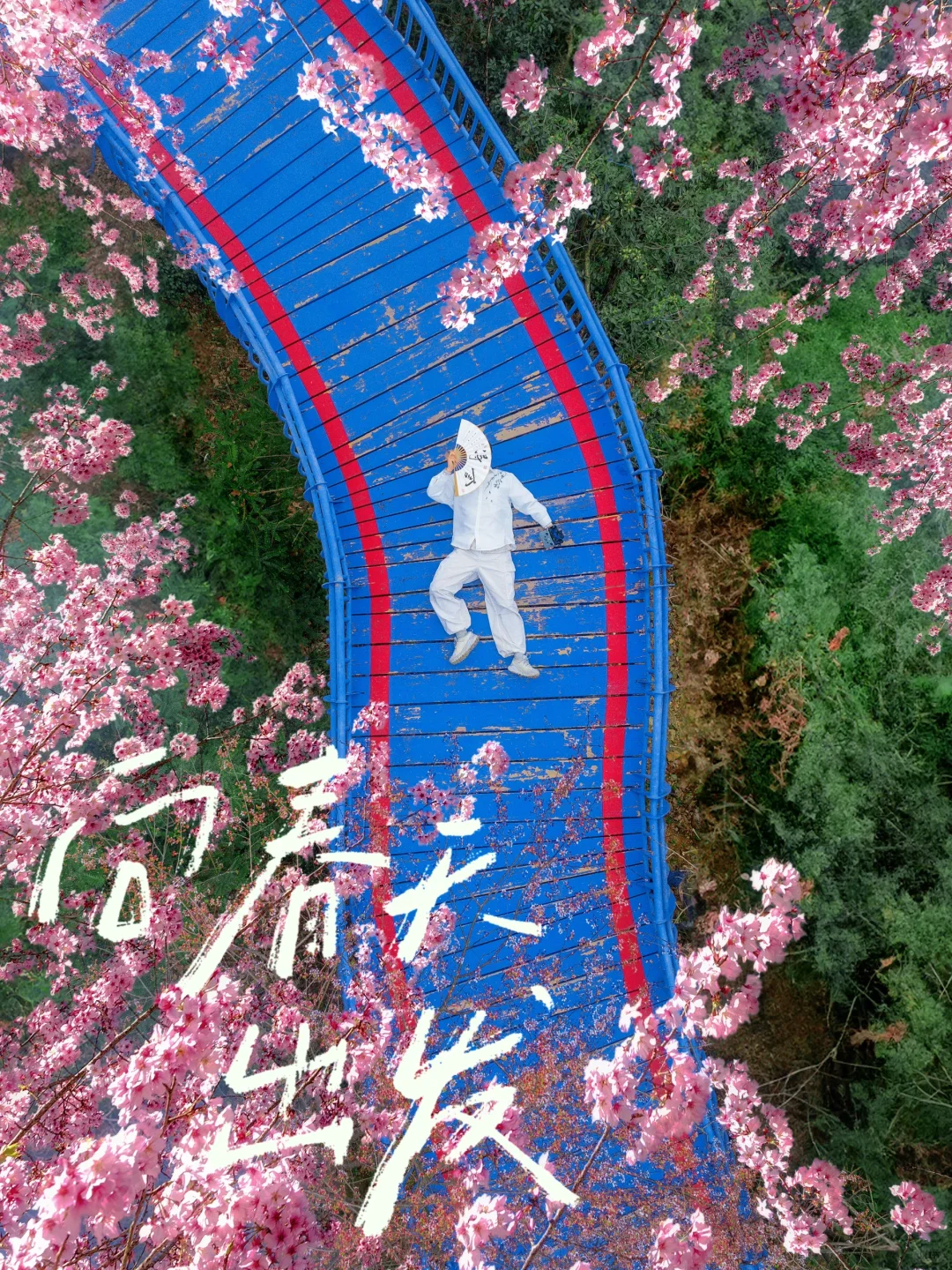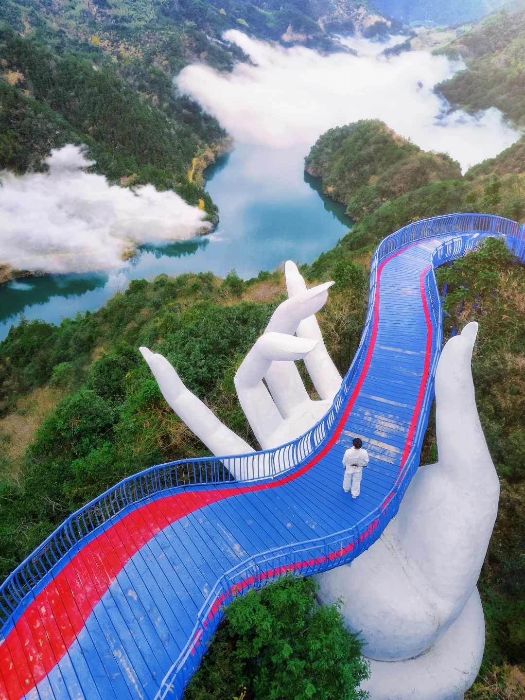 山间的紫色手形状的长廊,被一双巨型的纤纤玉手托举而起,这里有大片的樱花林,漫步樱花之中