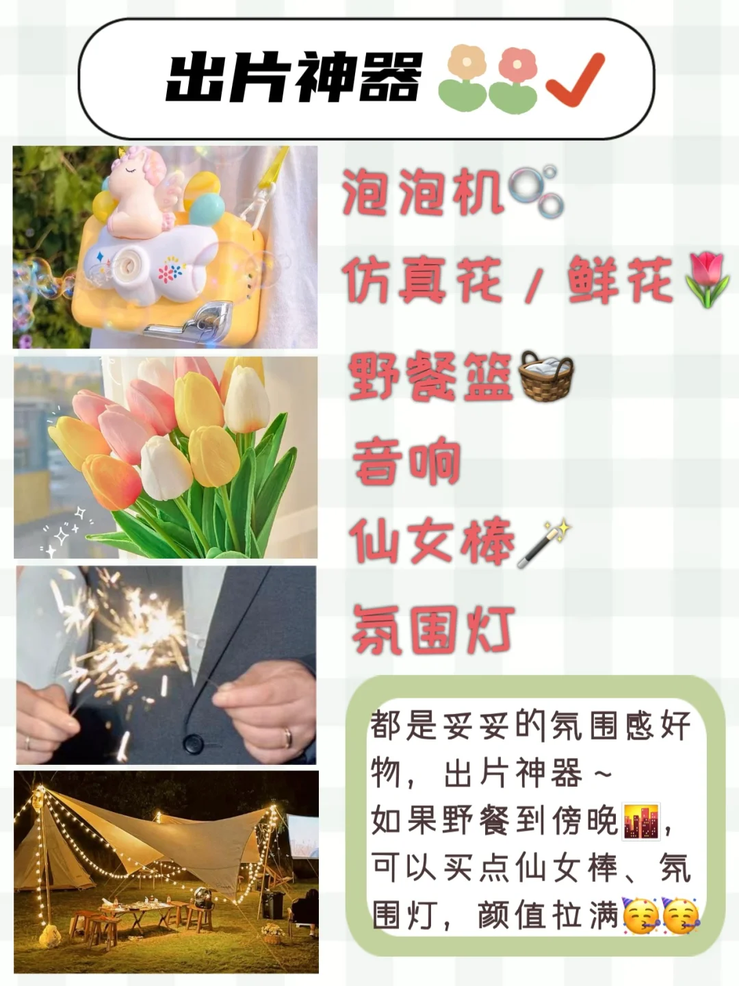 氛围感好物👉👉野餐篮、鲜花💐、泡泡机、音响、仙女棒🎇、自拍杆🤳