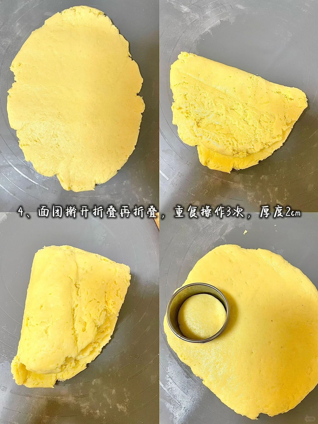 4⃣️面团擀开折叠再折叠,重复操作3次,厚度2cm,借助工具切割成圆形,表面刷一点蛋液