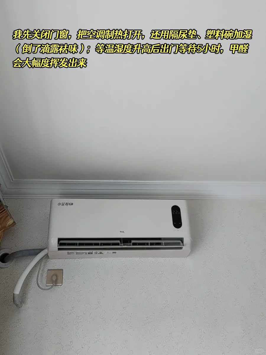 [举手R]甲醛不耐高温湿,我就先关闭门窗,把空调制热模式打开,还学网友用隔尿垫、塑料碗这些东西加湿(倒了滴露祛味);等温湿度升高后,我就出门等待5小时🕔甲醛会大幅度挥发出来