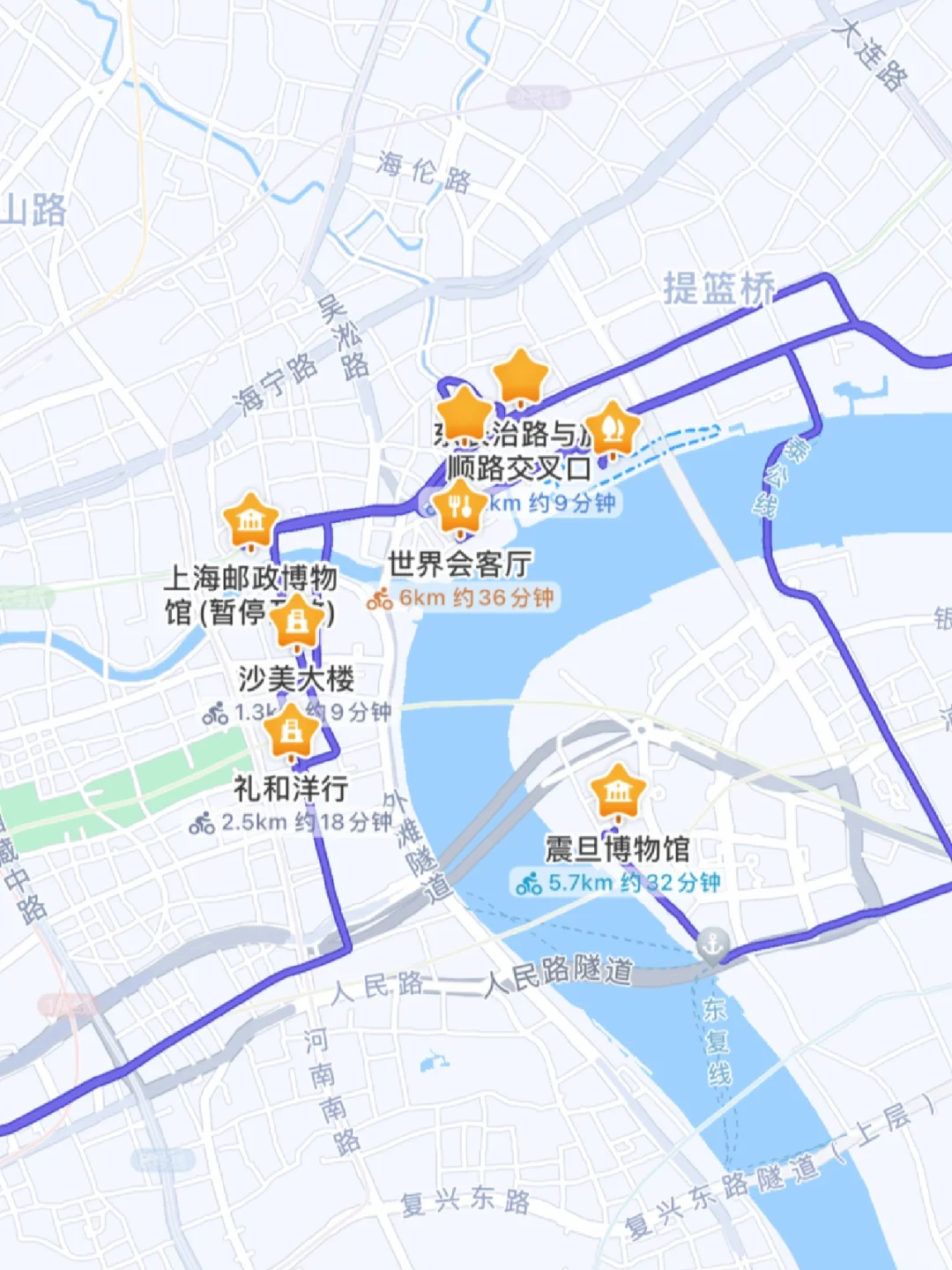 永嘉路与太原路交口绿房子➡️礼和洋行➡️沙美大楼➡️邮政博物馆➡️世界会客厅➡️长治路与九龙路交口➡️平安里➡️新天安堂➡️北外滩滨江绿道➡️歇浦路渡口