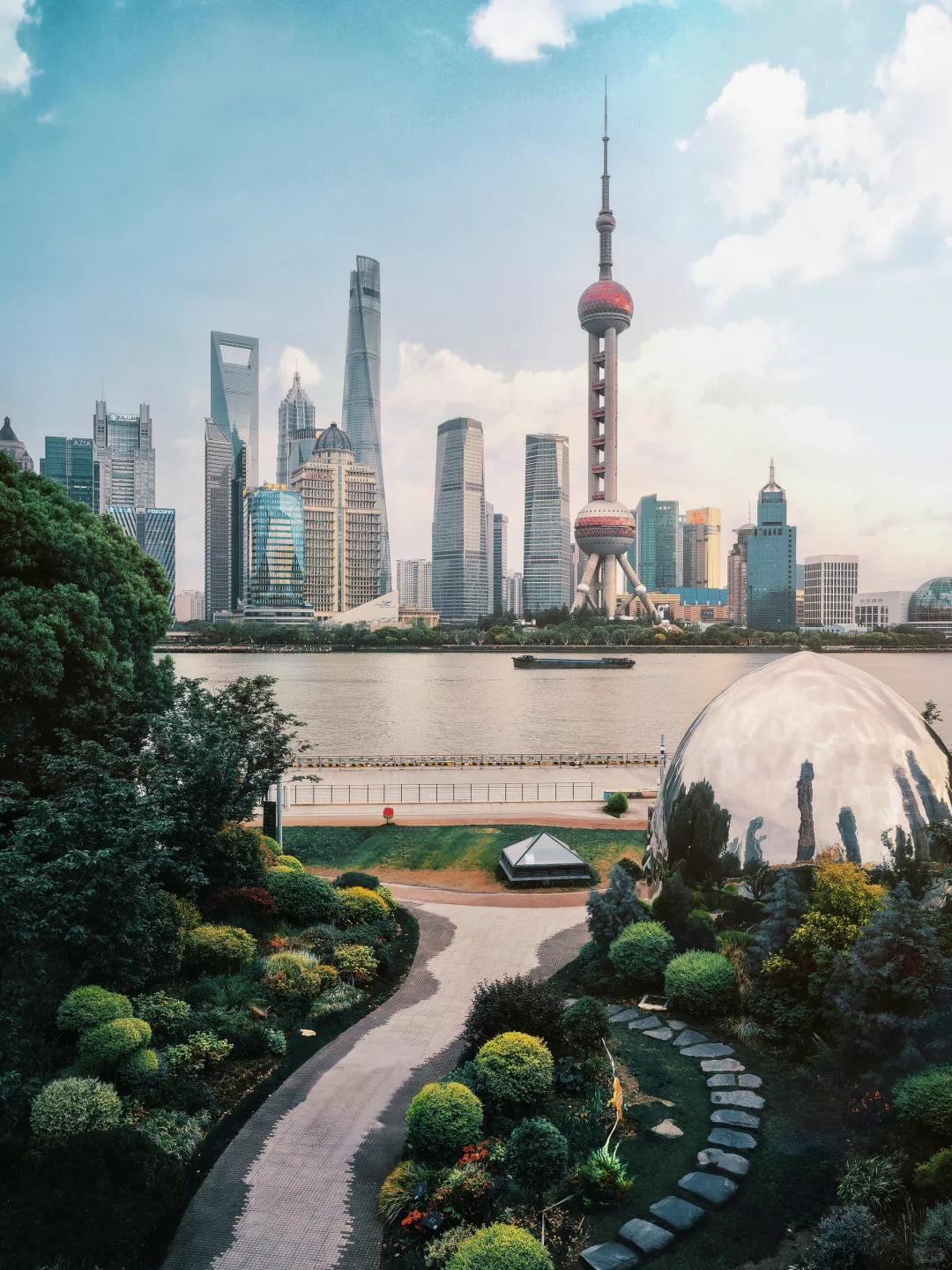 对比外滩的人挤人,这里连着北外滩滨江绿道的巨蛋一起打卡江对面的上海三件套,科技感满满。