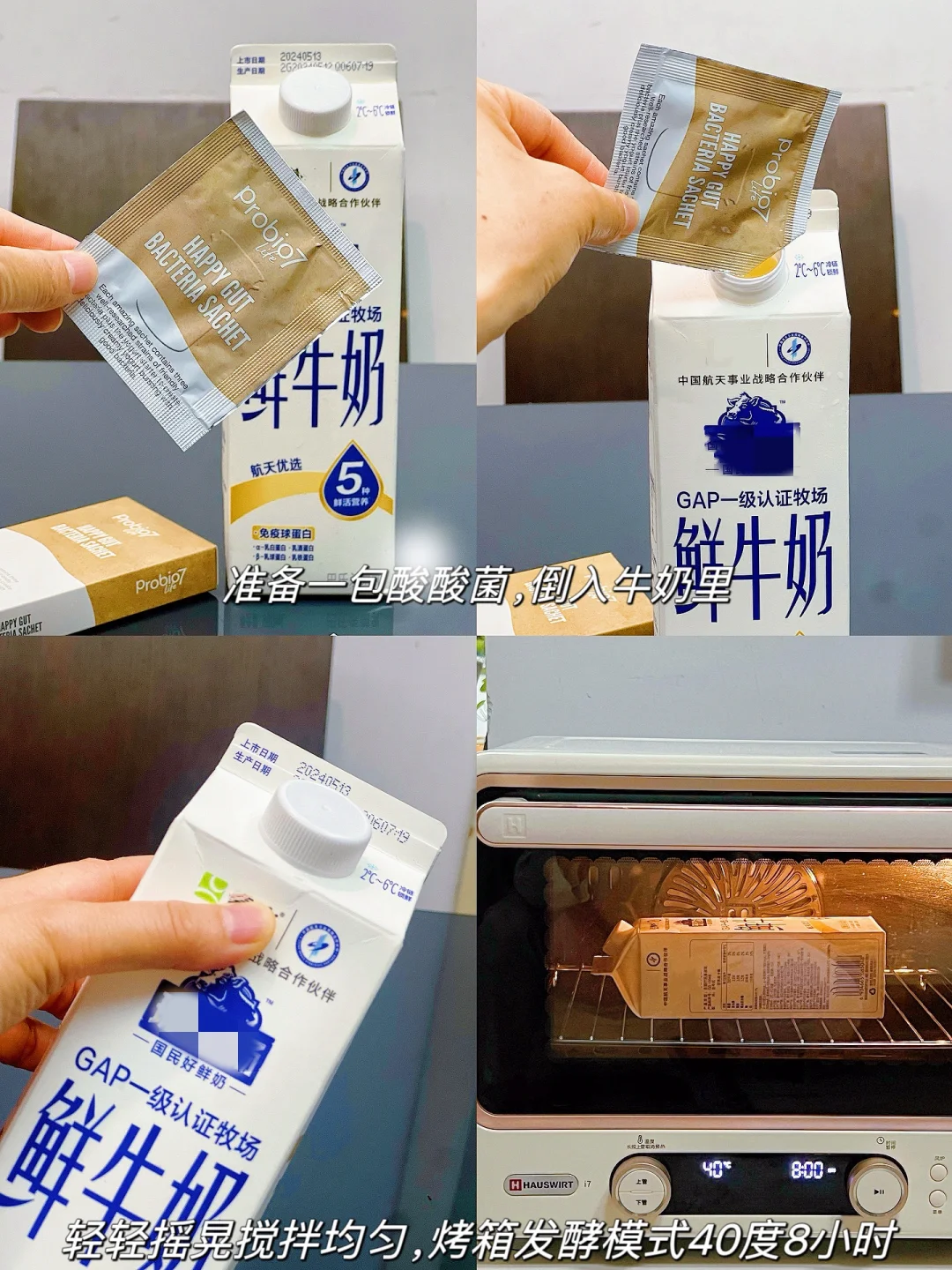 1️⃣一包酸酸菌倒入牛奶盒里,轻轻摇晃均匀