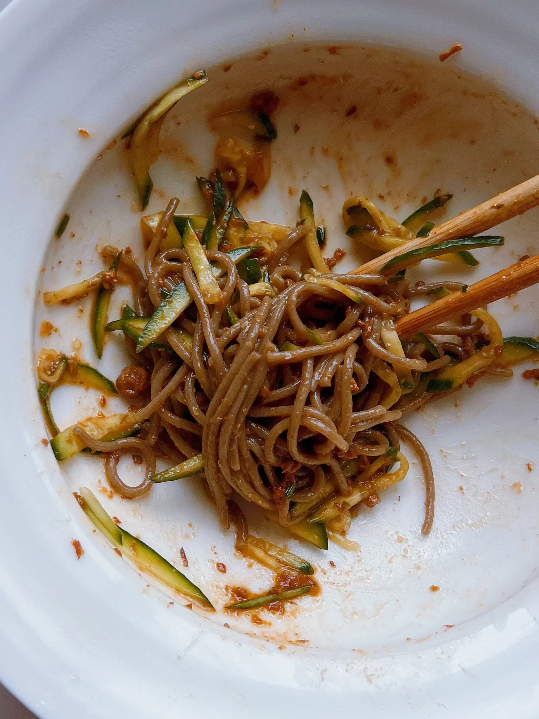 减脂期吃什么 早上随便煮一点荞麦面 切了一根黄瓜丝 舀两勺朋友送的猪肉酱 拌一拌就可以了 特别好吃!