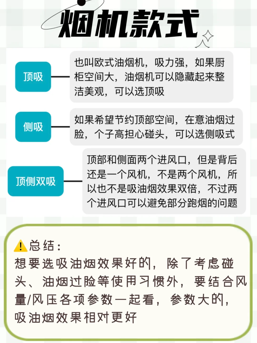 常见的油烟机有顶吸、侧吸、顶侧双吸三种,想要选吸油烟效果好的,除了考虑碰头、油烟过脸等使用习惯外,要结合风量/风压各项参数一起看,参数大的,吸油烟效果相对更好