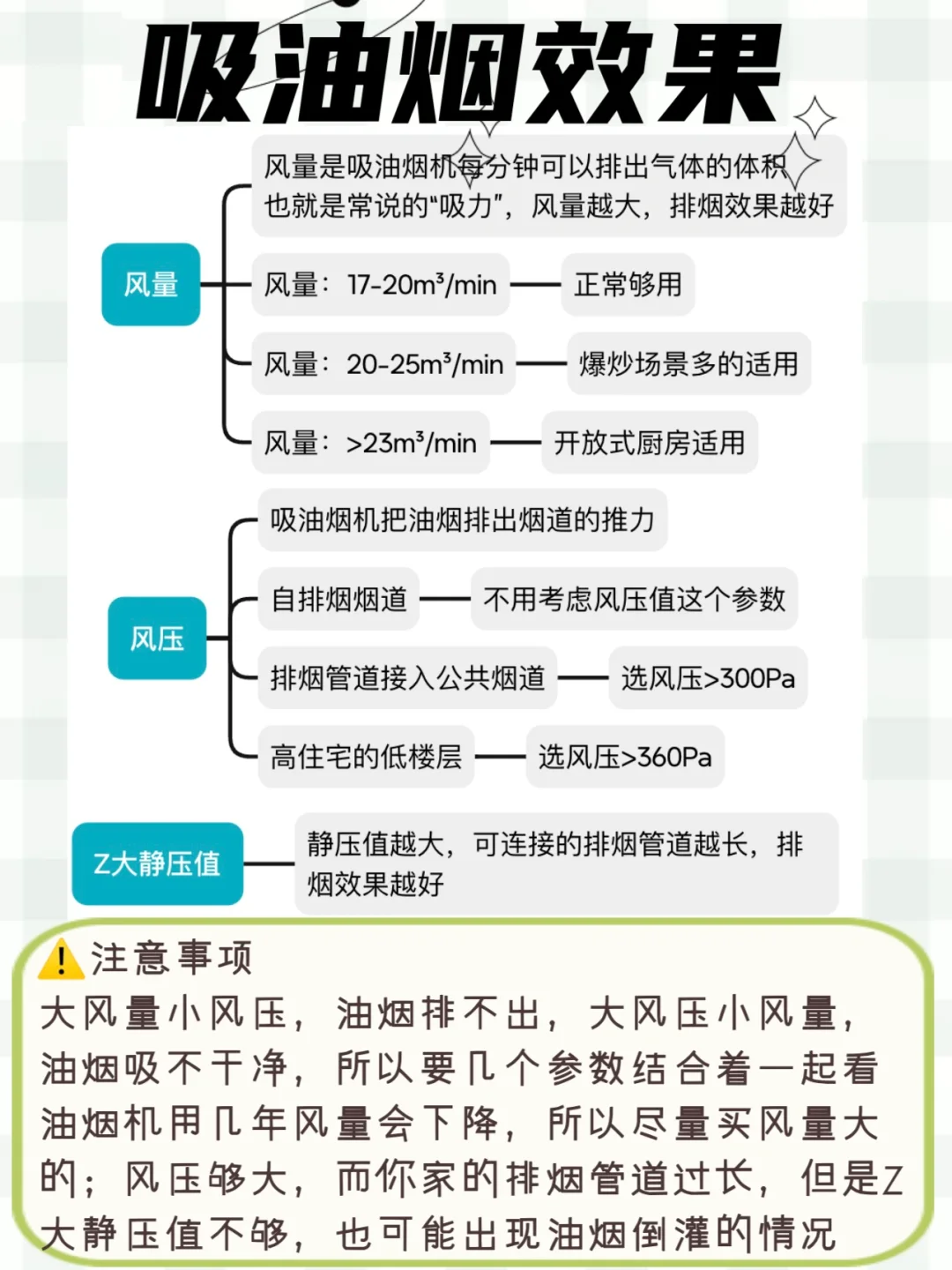 和吸油烟效果强相关的三个参数:风量、风压、Z大静压值