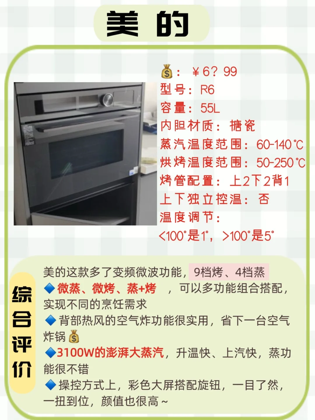 图6-10挑了几款各个品牌具有代表性的蒸烤箱,做了参数对比,大家可以参考~
