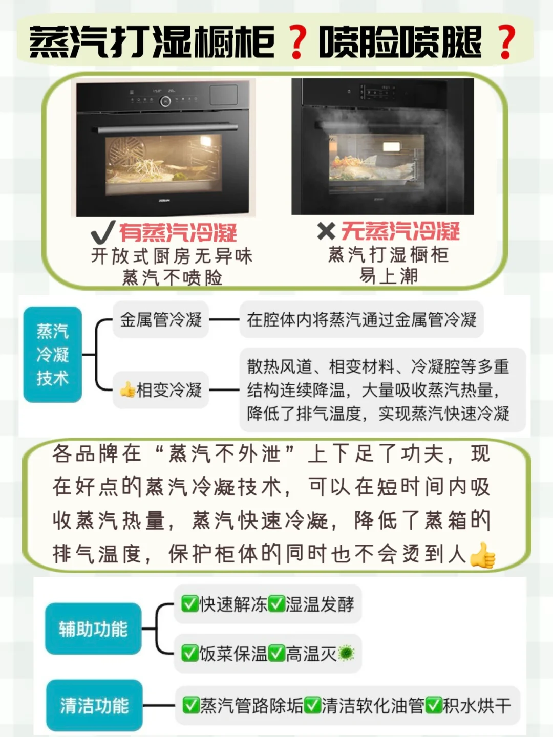 现在好点的蒸汽冷凝技术,可以在短时间内吸收蒸汽热量,通过散热风道、冷凝腔等连续降温,蒸汽可以快速冷凝,很大程度上降低了蒸箱的排气温度,保护柜体的同时也不会烫到人👍