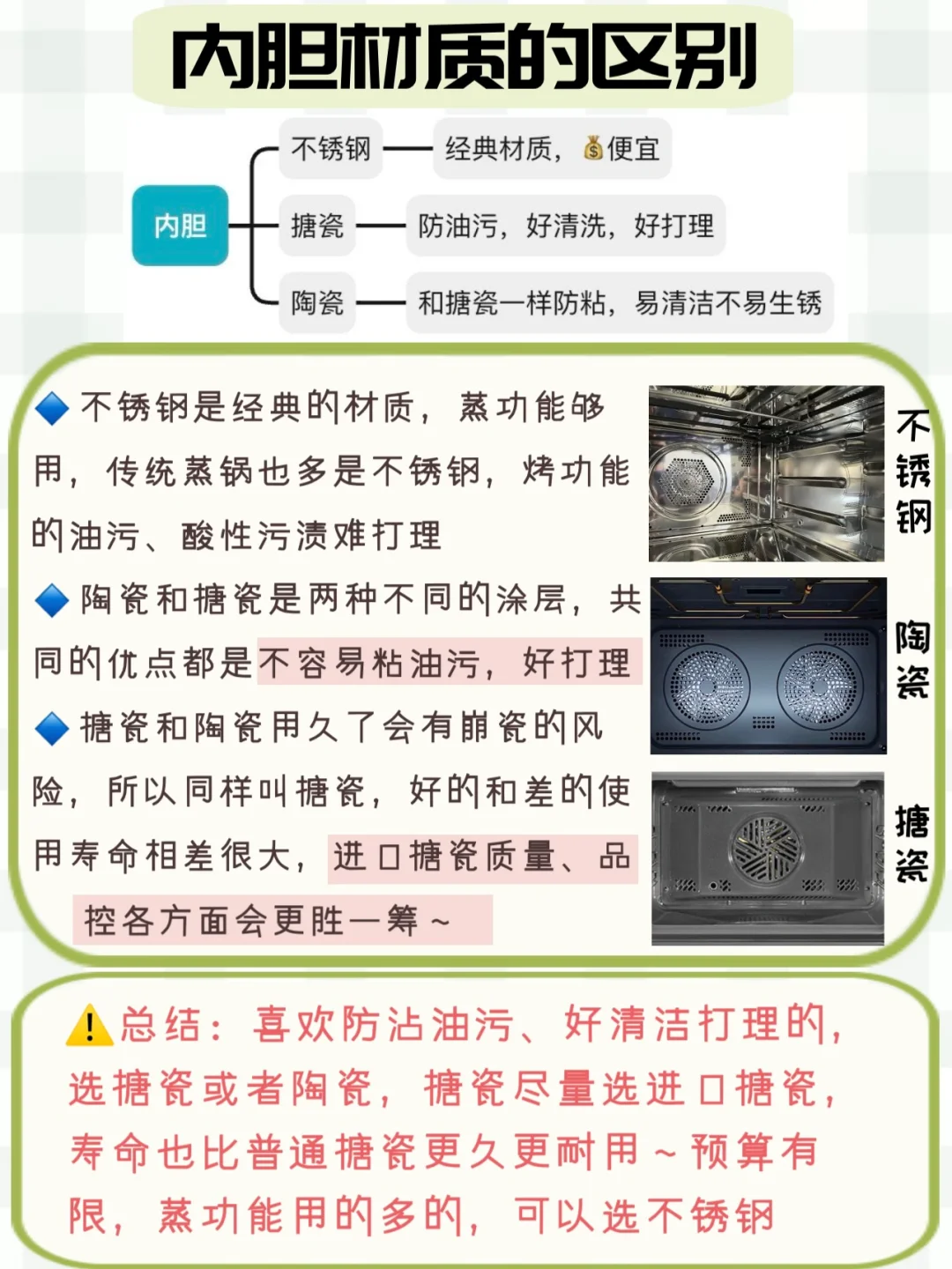 现在市面上蒸烤一体机常见的内胆是:不锈钢、陶瓷、搪瓷,具体区别看图5⃣️⬆️⬆️