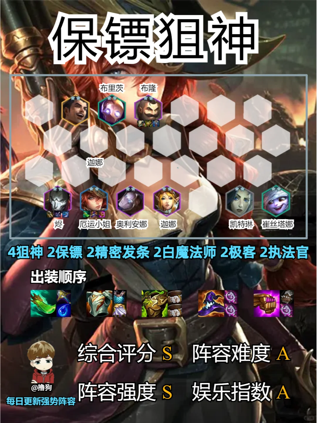 1️⃣先做女枪和布隆的装备,烬带多余物理输出装,杰斯带多余肉装,发条带多余法系输出装 2️⃣烬和女枪谁做主C都可以,取决于前期女枪的数量以及物理装多还是法系装多 3️⃣如果有狙神纹章,可以开6狙神,也可以下崔丝塔娜换塔里克,多一个白魔法师 ❗阵容码进笔记下方粉丝群,有问题都可以问,都会回答