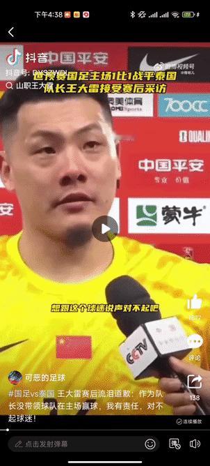 心疼王大雷!王大雷:想跟球迷说声对不起,作为队长我没能带队取胜! 世预赛亚洲区第二阶段C组第5轮,中国男足主场1-1战平泰国队,这个丢球最大责任人非门将王大雷,而赛后王大雷主动拦责,跟球迷道歉,为在在主场没能赢下泰国,而感到遗憾,自责! 他还说道,足球比赛我觉得就是团队的运动,不能说是某一个人,作为队长我没能带领球队取得胜利,当然我有责任,而且今天年轻球员发挥得非常好,很庆幸的是年轻球员进球了。可能我的责任大些,我没有带领他们好的完成任务,作为队长也是场上最年长的球员,没能帮助到球队我有责任!谢谢球迷们的支持! 不知道大家有没有发现,当费南多罚点球的那刻,场上最紧张的除了费南多就是王大雷了,他用球衣遮面,根本不敢直视罚点球!当得知点球未进,王大雷更是跪地长啸,最后赛后谢场时,王大雷终于控制不住内心的委屈,泪流满面,作为门将他真的竭尽全力了,扑出的2个必进球就是最好的证明! 正如泰国主帅小日子说的,若不是中国门将表现出色,扑出几个必进球,最后我们就完成绝杀了 !
