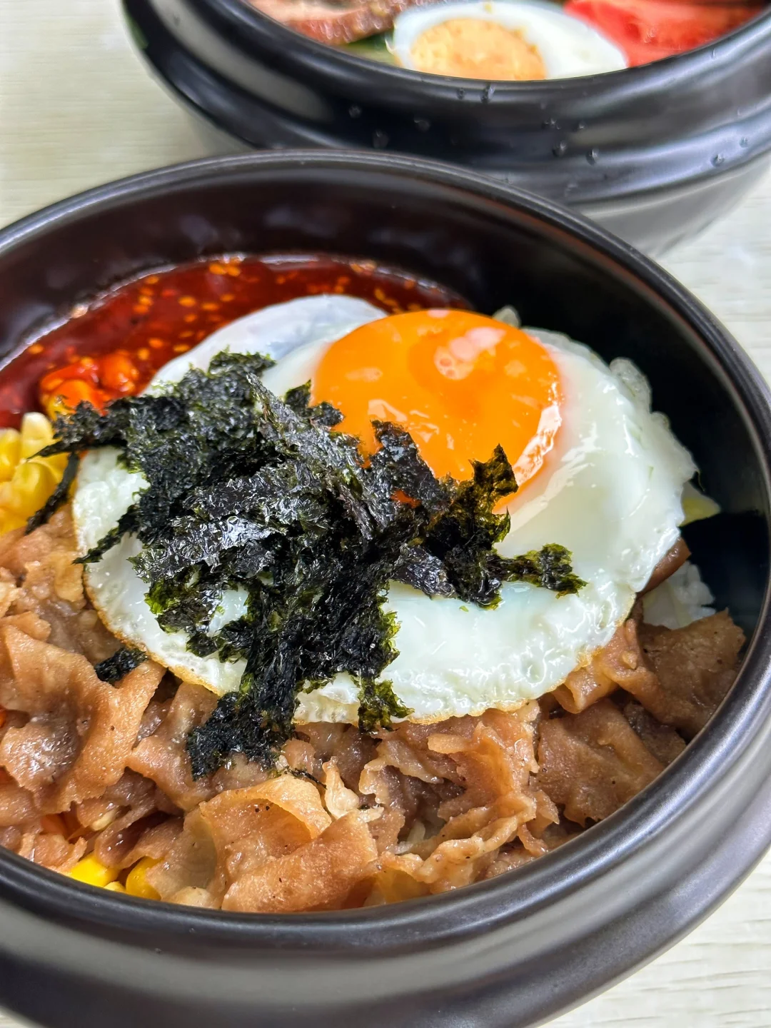 肥牛石锅拌饭,肥牛分量还是比较多,是溏心蛋,米粒也是比较分明的,整体会比较偏咸香,我们的话就觉得还可以,值得的这个价格🫡