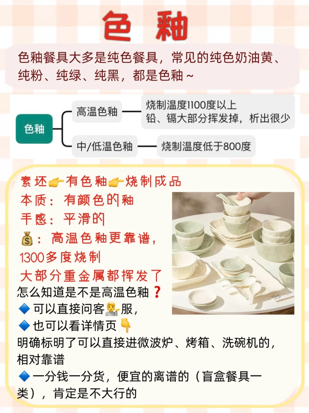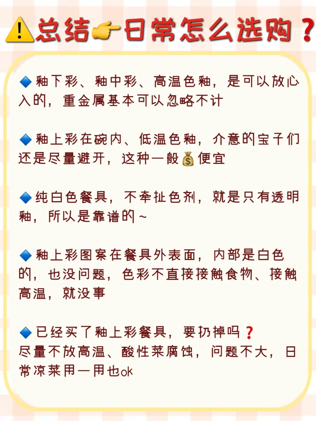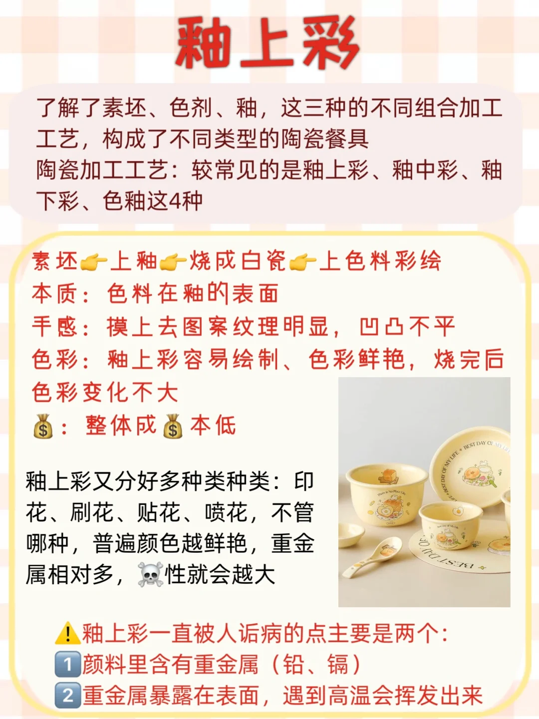 🔹釉上彩图案在餐具外表面,内部是白色的,也没问题,色彩不直接接触食物、接触高温,就没事