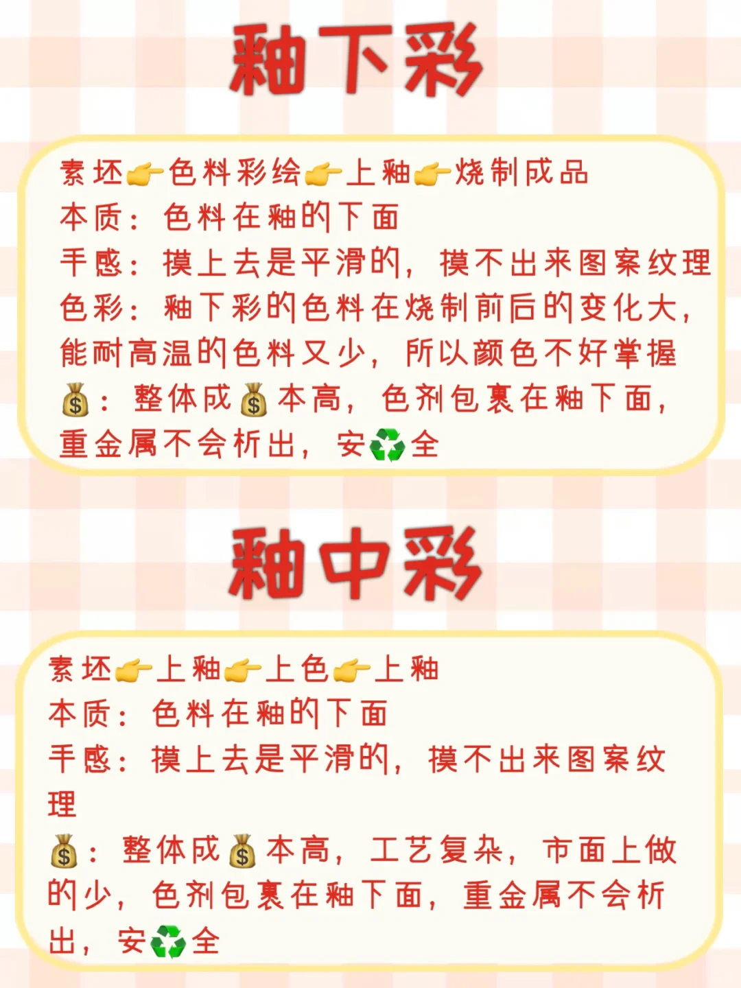 🔹釉下彩、釉中彩、高温色釉,是可以放心入的,重金属基本可以忽略不计