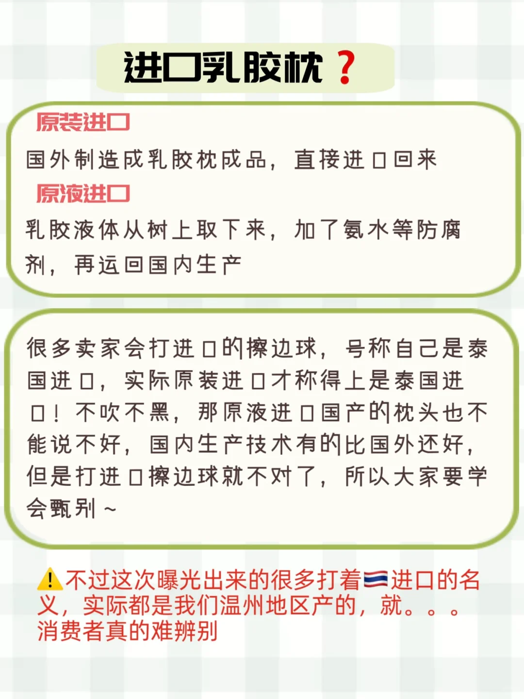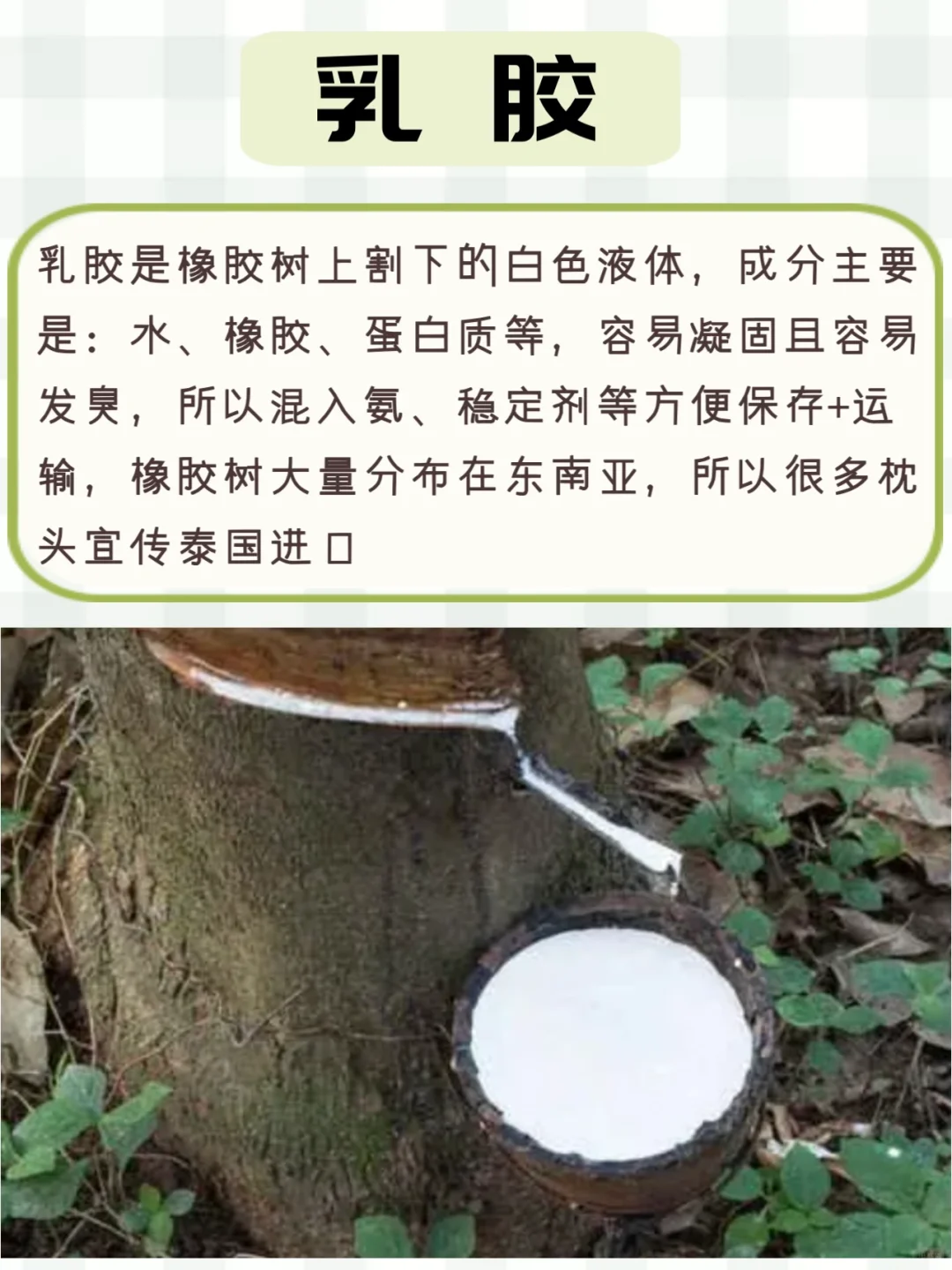乳胶是橡胶树上割下的白色液体,成分主要是:水、橡胶、蛋白质等,容易凝固且容易发臭,所以混入氨、稳定剂等方便保存+运输,橡胶树大量分布在东南亚,所以很多枕头宣传泰国进口