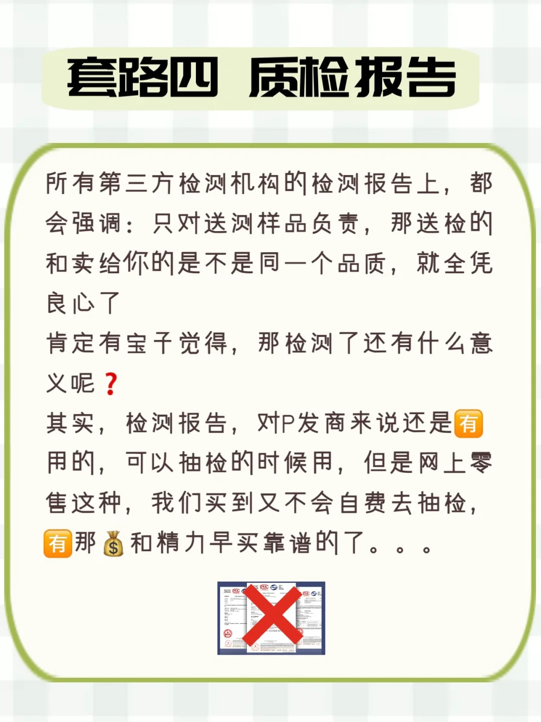 其实,检测报告,对P发商来说还是🈶️用的,可以抽检的时候用,但是网上零售这种,我们买到又不会自费去抽检,🈶️那💰和精力早买更贵的了。。。