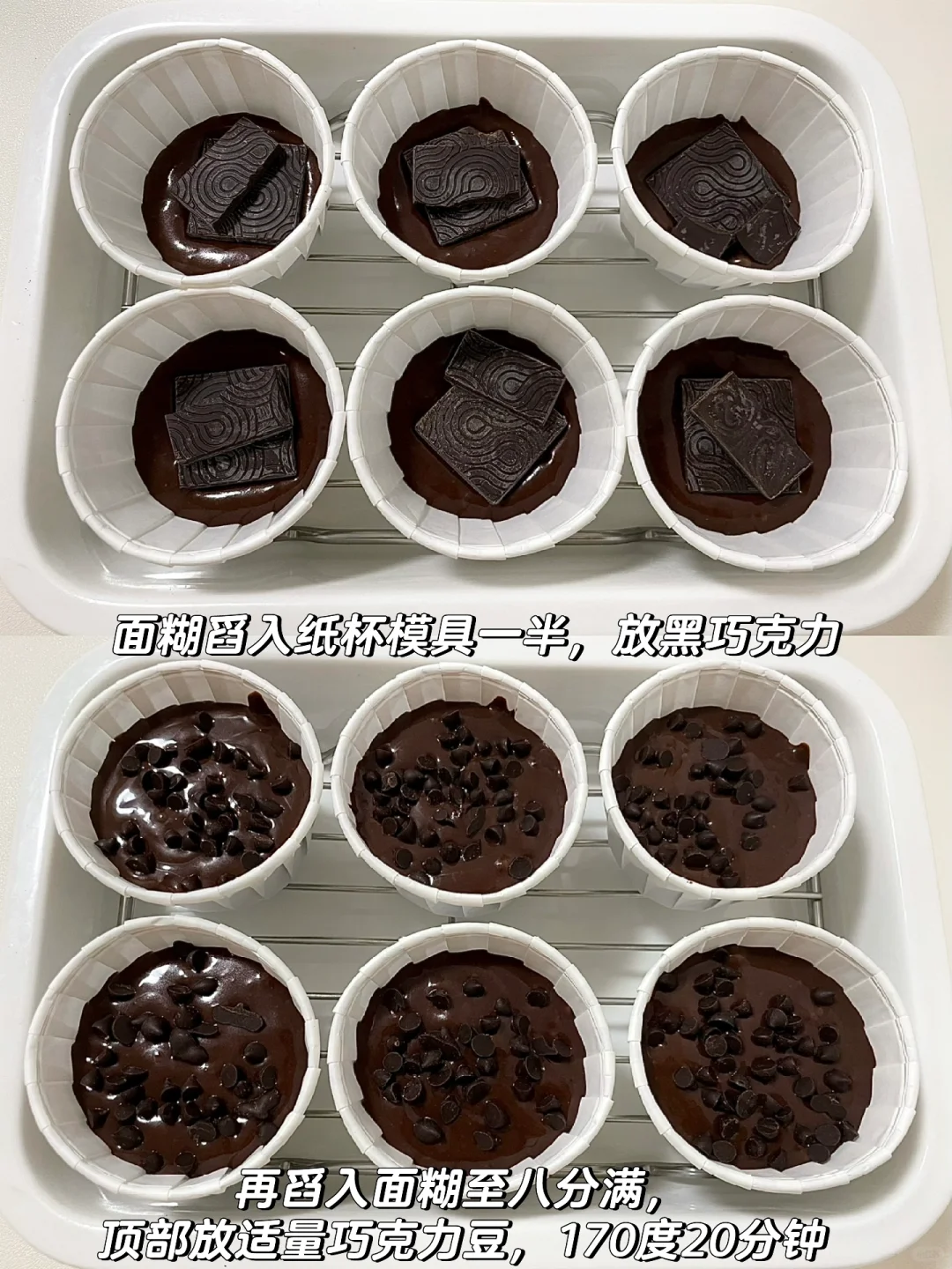4️⃣面糊舀入纸杯模具一半,放一块黑巧克力,再舀入面糊至八分满,顶部放适量巧克力豆,放入预热好的烤箱,参考温度170度20分钟