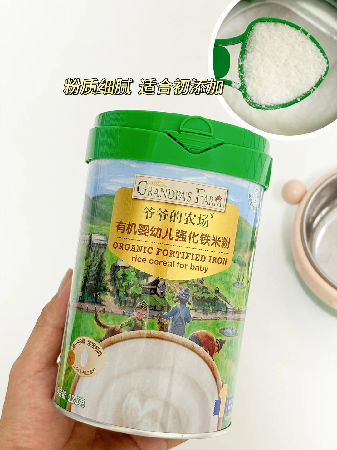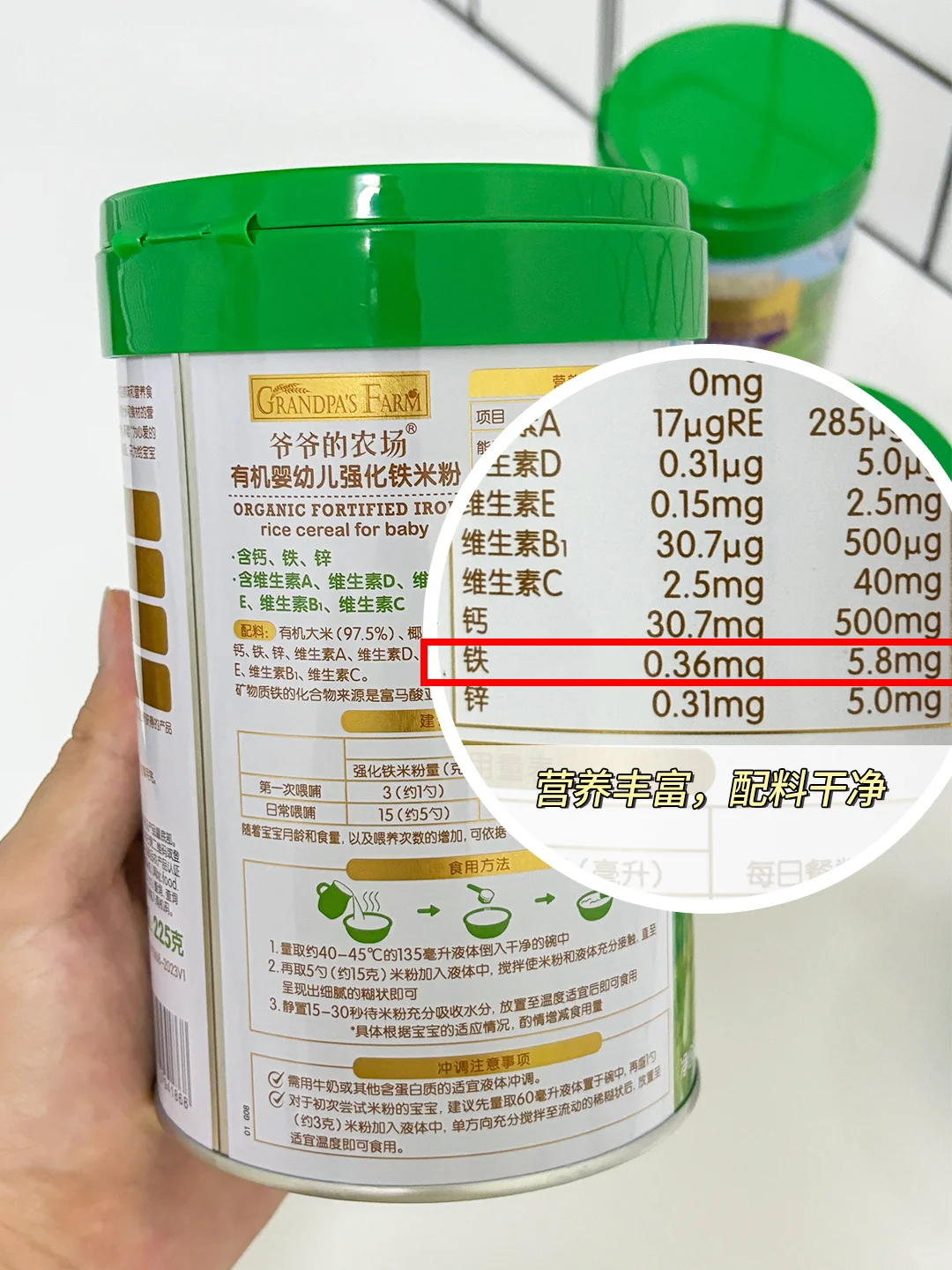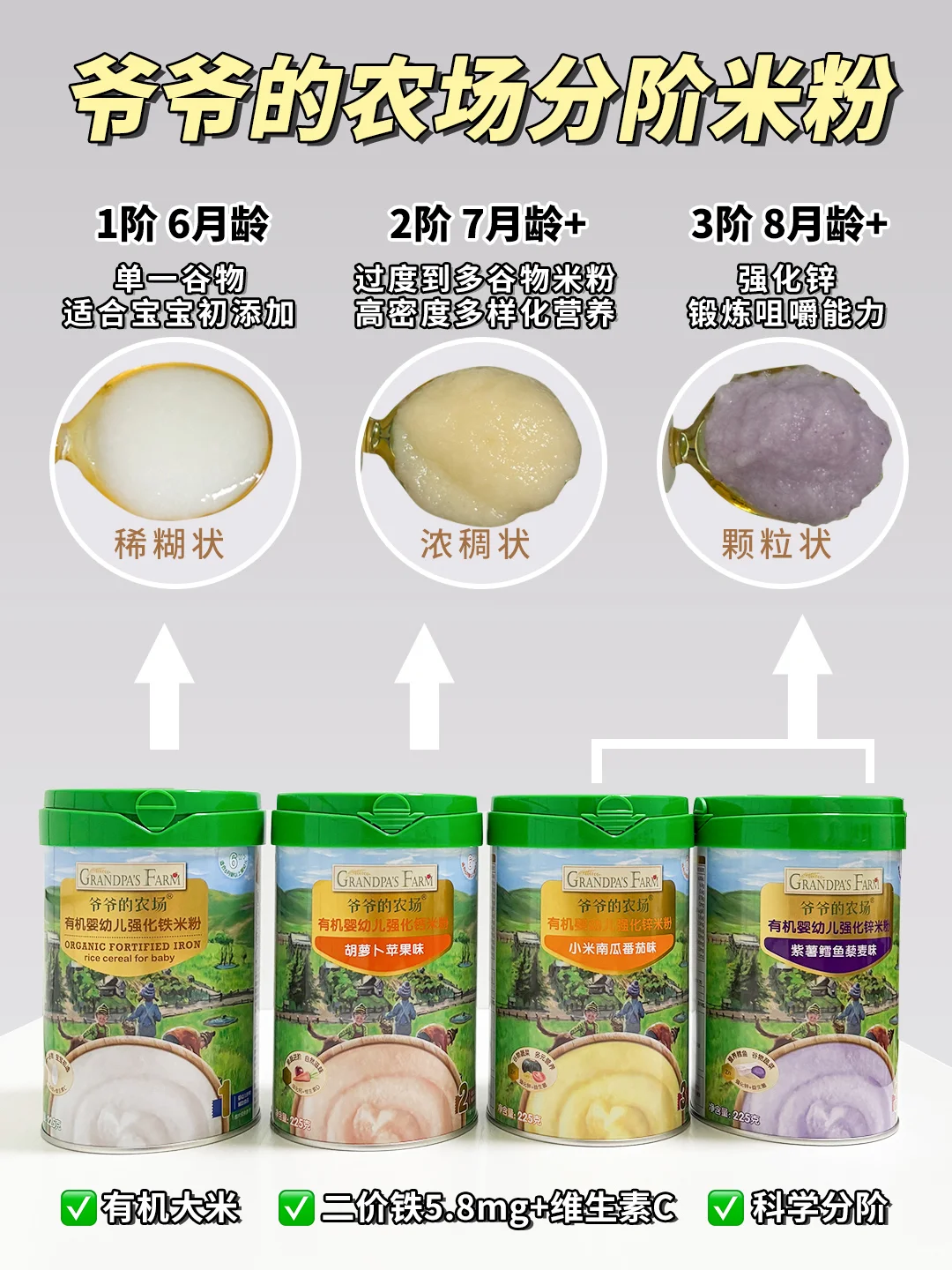 👶我给我家宝宝选择的是爷爷的农场米粉,选用优质有机大米,配料很干净。而且还是二价铁搭配维C的配方💯,铁含量5.8mg。还有贴心的“分阶喂养”,根据不同月龄宝宝营养需求,对应强化钙铁锌。