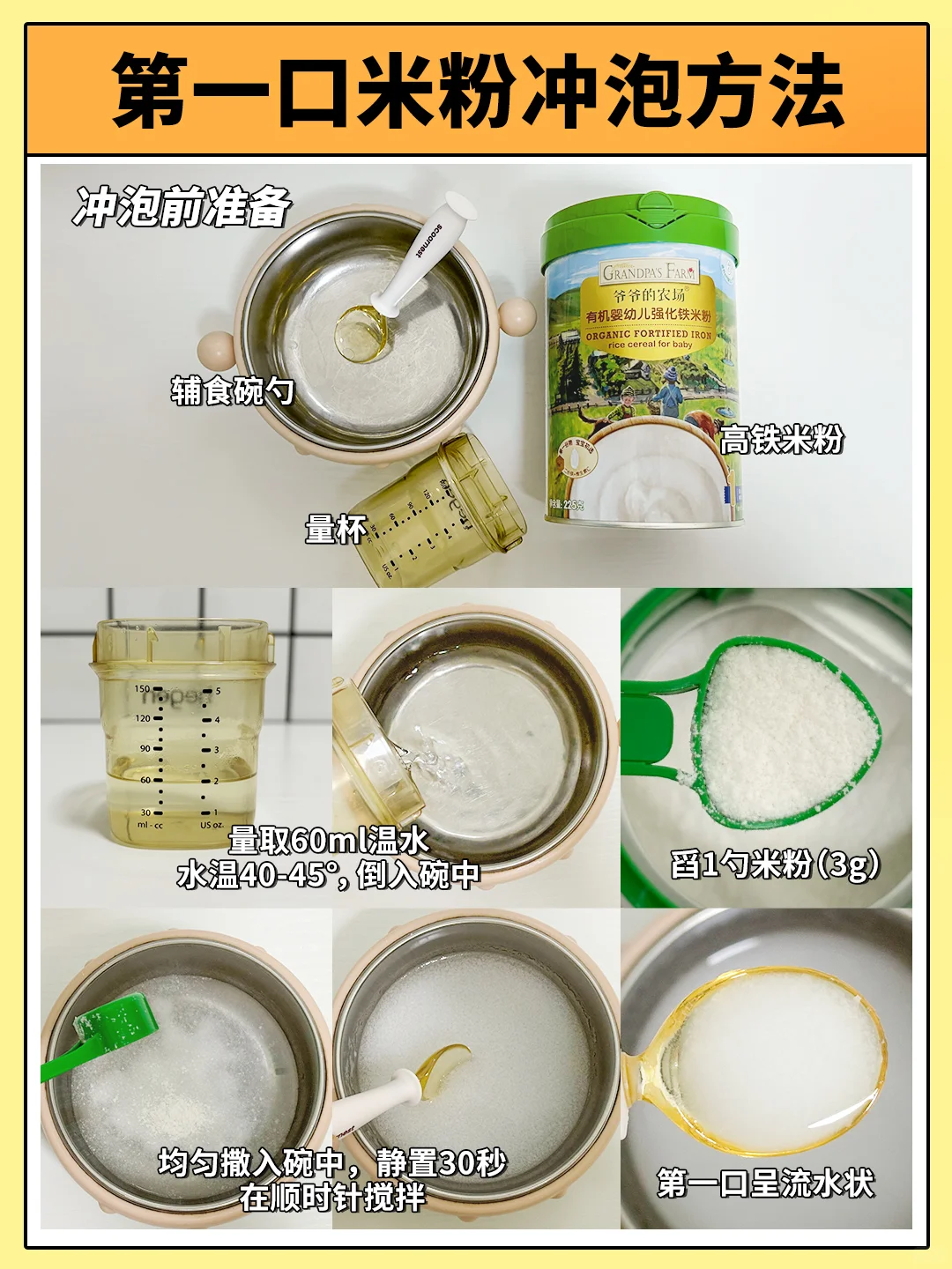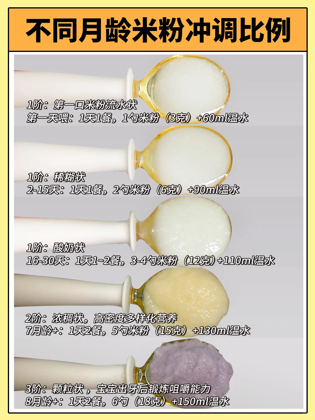 🚩米粉性状:第一口流水状—6月龄稀糊状到酸奶状—7月龄浓稠状-8月龄颗粒状