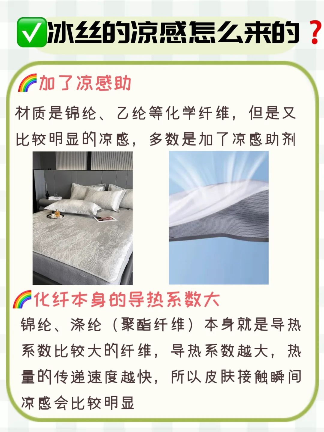 冰丝席多数是聚酯纤维,不透气,刚躺上去凉感,越躺越黏腻。" 冰丝凉感怎么来的? 加了凉感助剂