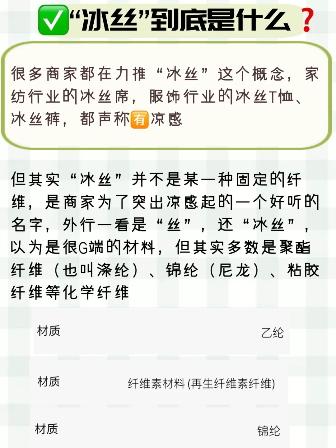 但其实“冰丝”并不是某一种固定的纤维,是商家为了突出凉感起的一个好听的名字,外行一看是“丝”,还“冰丝”,以为是很G端的材料,但其实多数是聚酯纤维(也叫涤纶)、锦纶(尼龙)、粘胶纤维等化学纤维