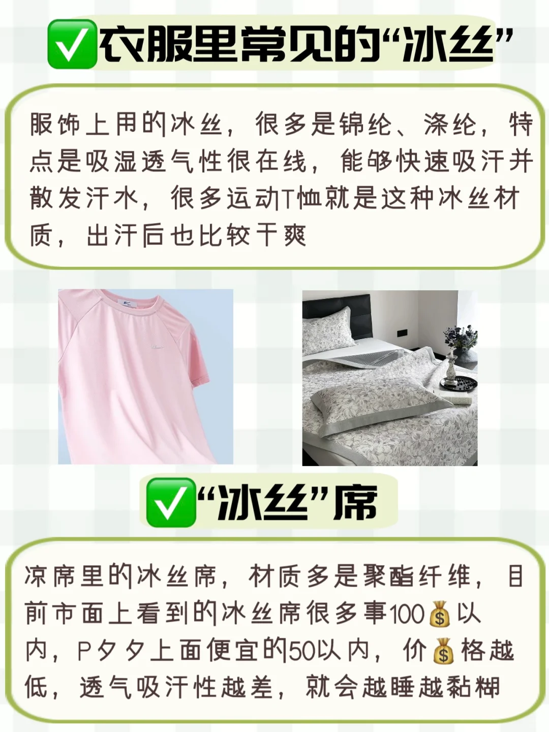 凉席里的冰丝席,材质多是聚酯纤维,目前市面上看到的冰丝席很多事100💰以内,P夕夕上面便宜的50以内,价💰格越低,透气吸汗性越差,就会越睡越黏糊