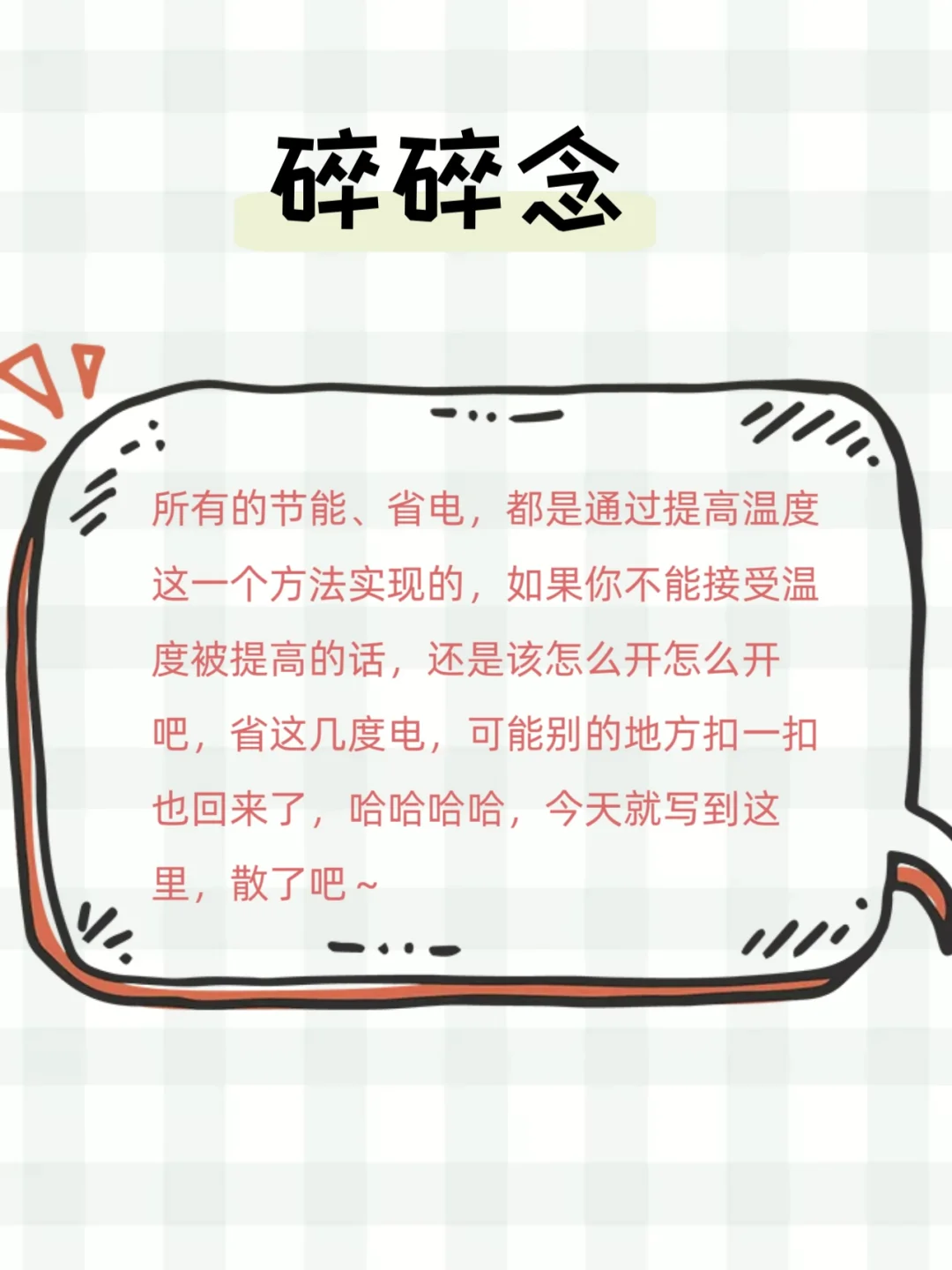 所有的节能、省电,都是通过提高温度这一个方法实现的,如果你不能接受温度被提高的话,还是该怎么开怎么开吧,省这几度电,可能别的地方扣一扣也回来了,哈哈哈哈,今天就写到这里,散了吧~
