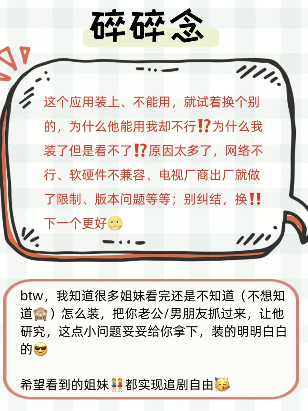 这个应用装上、不能用,就试着换个别的,为什么他能用我却不行⁉️为什么我装了但是看不了⁉️原因太多了,网络不行、软硬件不兼容、电视厂商出厂就做了限制、版本问题等等;别纠结,换‼️下一个更好🌝