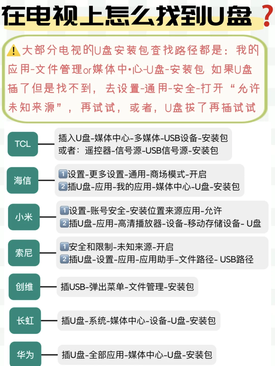 ⚠️大部分电视的U盘安装包查找路径都是:我的应用-文件管理or媒体中·心-U盘-安装包 如果U盘插了但是找不到,去设置-通用-安全-打开“允许未知来源”,再试试,或者,U盘拔了再插试试