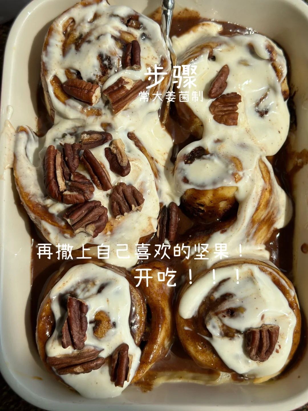 我的本命肉桂卷来啦! 之前和大家分享过这个宝藏配方!今天再来一遍~📚 ①馅料调成了很润质感(不太喜欢市面上直接上干粉的馅料!) ②那个奶酪酱🧀简直是灵魂!上面撒上你喜欢的坚果,一整个无敌子! ③烤之前一定要浇肉桂酱!浇和不浇差别贼大! (立刻就甩店售一大截!)✌🏻
