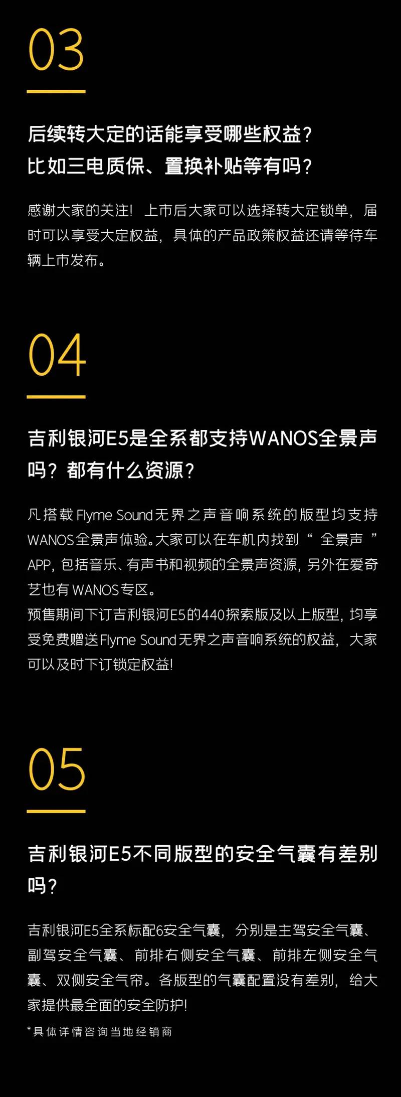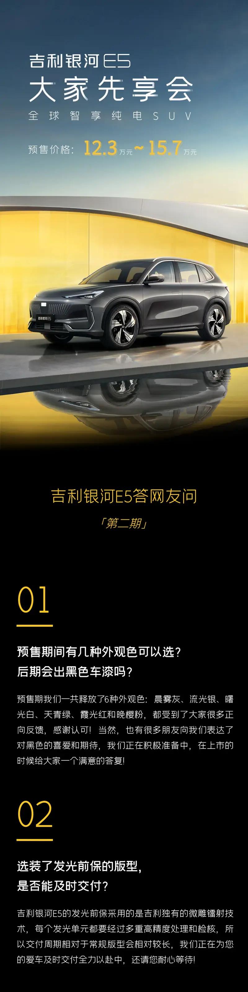 【吉利银河E5答网友问第二期 解答车身颜色/大定权益等问题】吉利银河官方发布了银河E5答网友问第二期,关于预售期间有几种外观颜色可选?后续转大定能享受哪些权益?不同版型的安全气囊有差别吗?等热门问题进行解答。 预售期吉利银河E5共释放了6种外观色,至于大家很喜爱并期待的黑色,官方会在新车上市的时候给大家一个满意的答复!全系标配6安全气囊,可提供最全面的安全防护,具体详情可咨询当地经销商。【来自懂车帝车友圈】