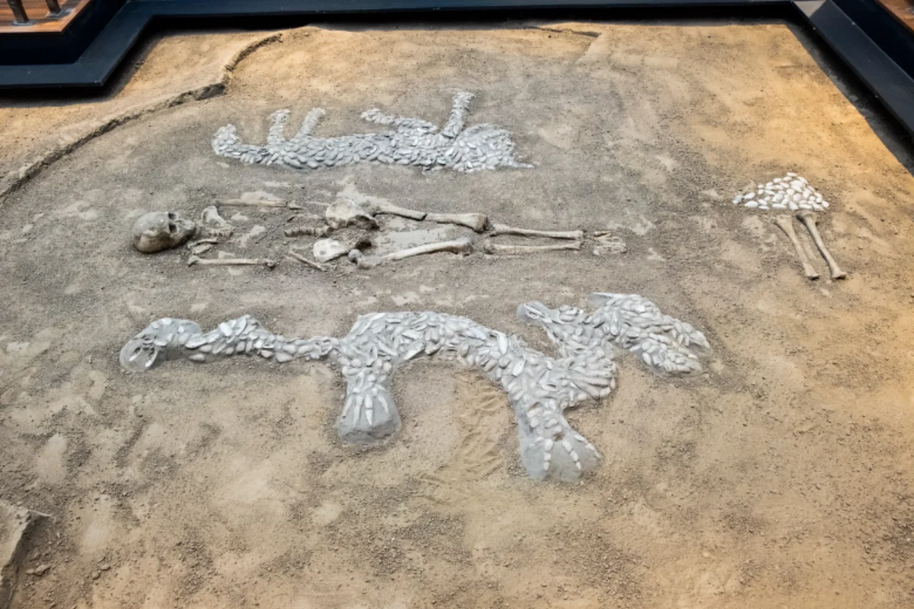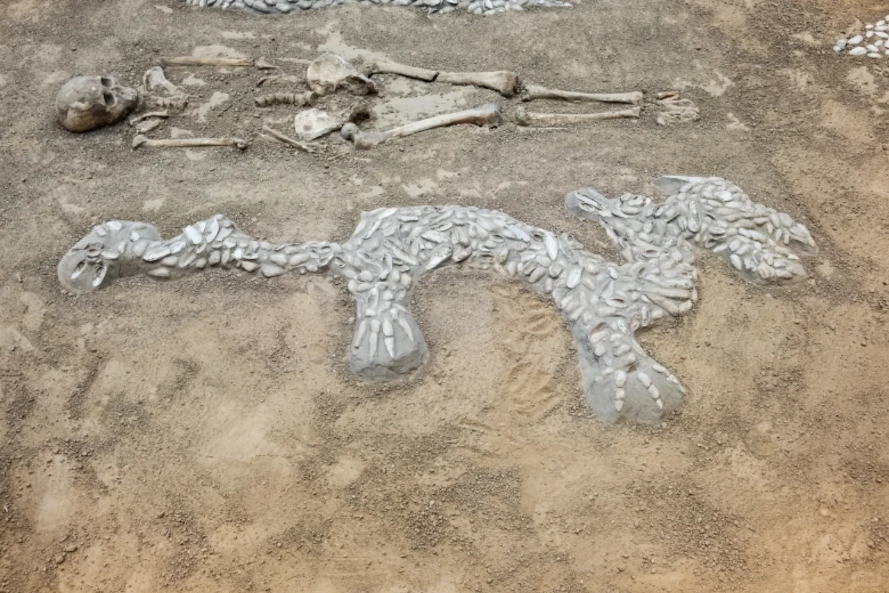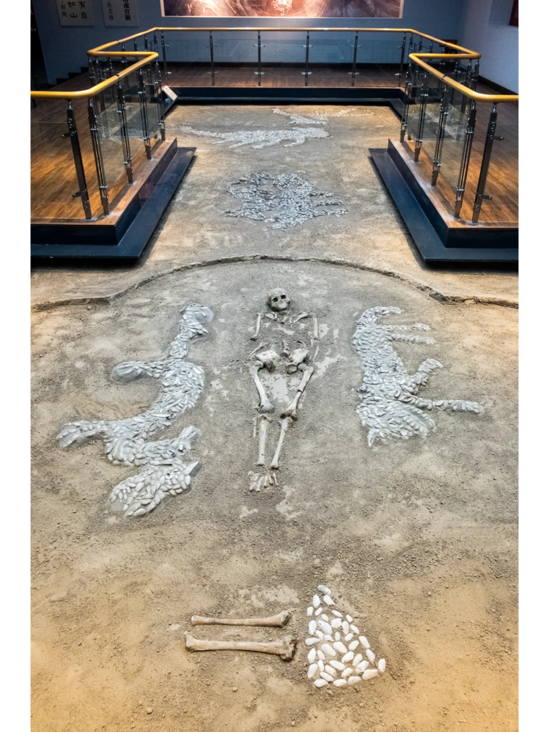 “西水坡遗址东周 时期的大型排葬坑, 共发现30余个, 从墓中的死者都是男性青年,年龄在20-25岁之间, 有不少骨架上留有射进的箭头,兵器和刀砍痕分析, 排葬坑中的死者不是正常死亡的, 有可能是在大的战争中阵亡的士卒。”