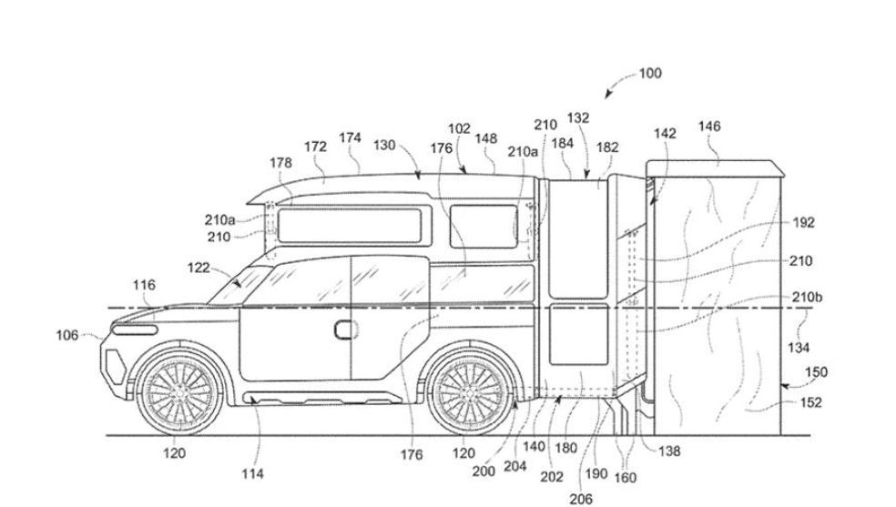 【拓展式露营车等 本田两项新专利曝光】日前,本田向美国专利管理机构申报了两项全新的专利,包括一款风格类似本田元素的拓展式露营车和一种尺寸可调的皮卡车货箱结构。 从专利图来看,这款拓展式露营车的设计灵感来源于本田元素,采用了对开式车门设计,车辆底盘比较高,越野属性较强,车尾配备了一个突出的露营拓展模块。本田元素是一款SUV车型,这款车的特点是拥有对开式的车门和方正的车身,不过该车早在2011年就已经停产。另一张专利图展示了这款车完全展开时的样子。可以看到新车的顶棚升高后可以形成一个类似车顶帐篷的空间,可以容纳两人在里面休息。车尾的露营模块展开后能形成一个类似遮阳棚的拓展空间,可以进行烹饪、乘凉等活动。 另一个专利则是专为皮卡车型设计的可调节货箱结构,货箱前方的挡板可以沿着两条导轨前后移动,以改变货箱和乘员舱的空间大小。此外,为了配合可移动的挡板结构,车顶也采用了可伸缩的设计,能够更灵活地改变车内的空间布局。【来自懂车帝车友圈】