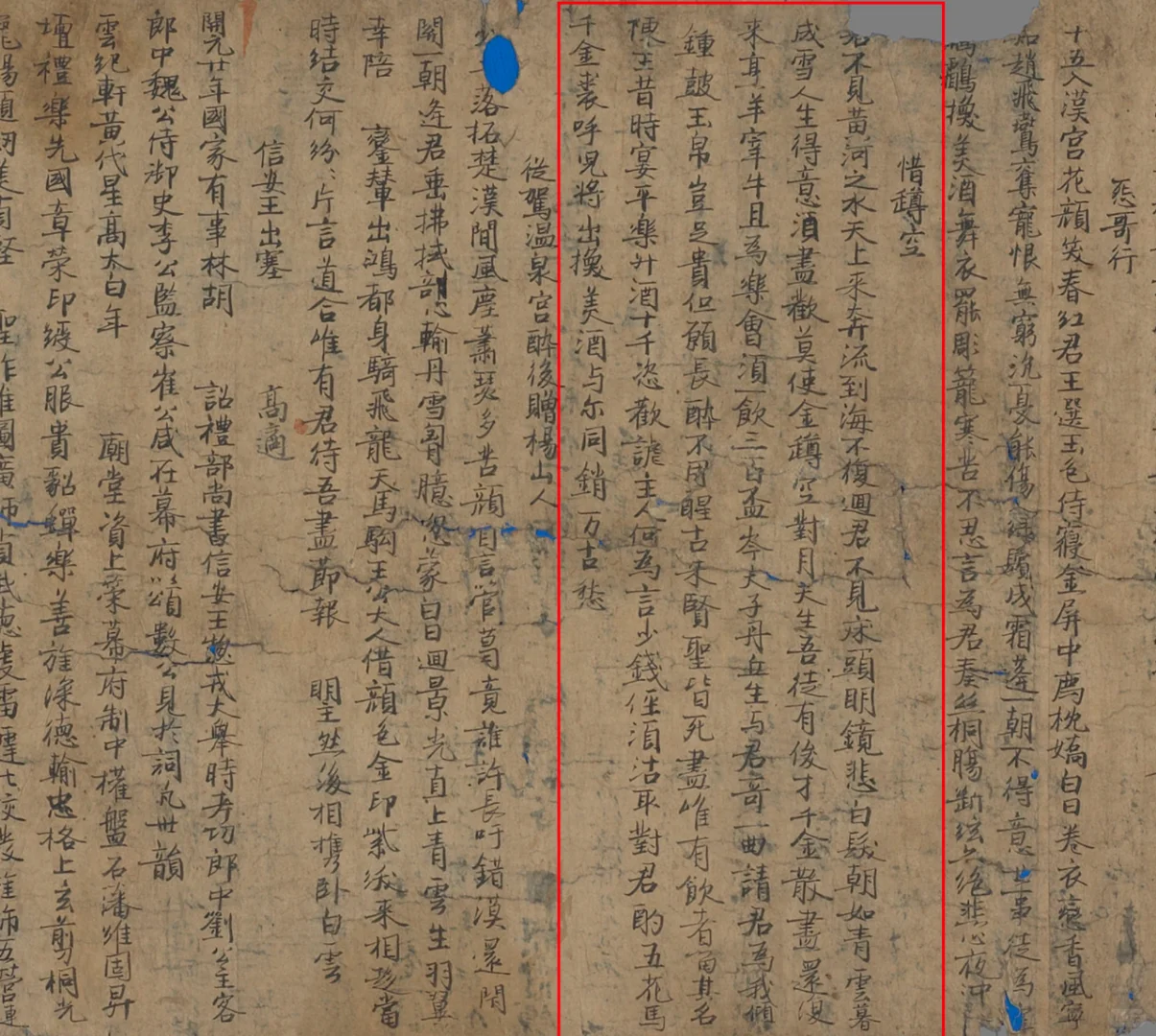李白的千古名篇《将进酒》中的那一句“古来圣贤皆寂寞”, 在唐代的敦煌遗书中是“古来圣贤皆死尽”,寂寞什么,就应该是死尽,这才是李白。 除了这个,古文版的《将近酒》还有很多不同之处,有兴趣的可以看看下面的对比: 1:题目《惜樽空》vs 《将进酒》 ( 宋咸淳本和宋蜀本皆作“将进酒”,诗题下注文“一作‘惜空樽酒”,“惜空樽酒” 应来源于“惜樽空”,推测“将进酒”是后来改的) 2: 床头明镜悲白发 vs 高堂明镜悲白发 3: 青云 vs 青丝 (黄永武云: “高堂悬镜难得去照,而床头明镜旦暮相照,则朝如青云,暮成白雪,上下用意贯联。……‘云’与‘雪’是同类的事物,用在一句中非常谐合,‘青云’与‘白云’的转换,趣味比‘青丝’‘白雪’好。”) 4: 天生吾徒有俊才 vs 天生我材必有用 (黄永武云: “李白《将进酒》一诗中脍炙人口的名句: ‘天生我材必有用。’也是后人窜改的,敦煌本中李白原来是写‘天生我徒有俊才’,‘才’与下文‘千金散尽还复来’‘会须一饮三百杯’的‘来’‘杯’是押韵的,后人改成‘天生我才必有用’,用字不押韵,显露出错误的痕迹) 5: 钟鼓玉帛岂足贵 vs 钟鼓馔玉不足贵 (黄永武:馔玉是指筵席上珍美的食品,正在烹羊宰牛、劝酒作乐,总不该说所食的珍品不足贵吧? 况且钟鼓是乐器,馔玉是食物,又如何连成 4 字都不足贵呢? 后人读了千余年,没发觉有问题,直待敦煌本出现,才知道李白的原文是‘钟鼓玉帛岂足贵’,钟鼓齐备是诸侯的乐器陈设,玉帛是诸侯相见时,互赠的礼物,‘钟鼓玉帛’是比喻诸侯显赫的地位不足贵,不是说眼前的乐队食品不足贵) 6: 岑夫子丹青生之后,今本多了“将进酒,杯莫停” (三个敦煌版本都没有这一句,应该是后期所增加) 7: 请君为我倾 vs 请君为我倾耳听 (与君歌一曲,请君为我倾,对仗工整,大概率“耳听”是后加的) 敦煌遗书是指敦煌藏经洞保存下来的古代文书,从北朝到宋,都是一手的原始资料,一个绝对的宝藏。 相比敦煌的壁画,敦煌遗书了解的人不多,以后会多发一些介绍的文章。