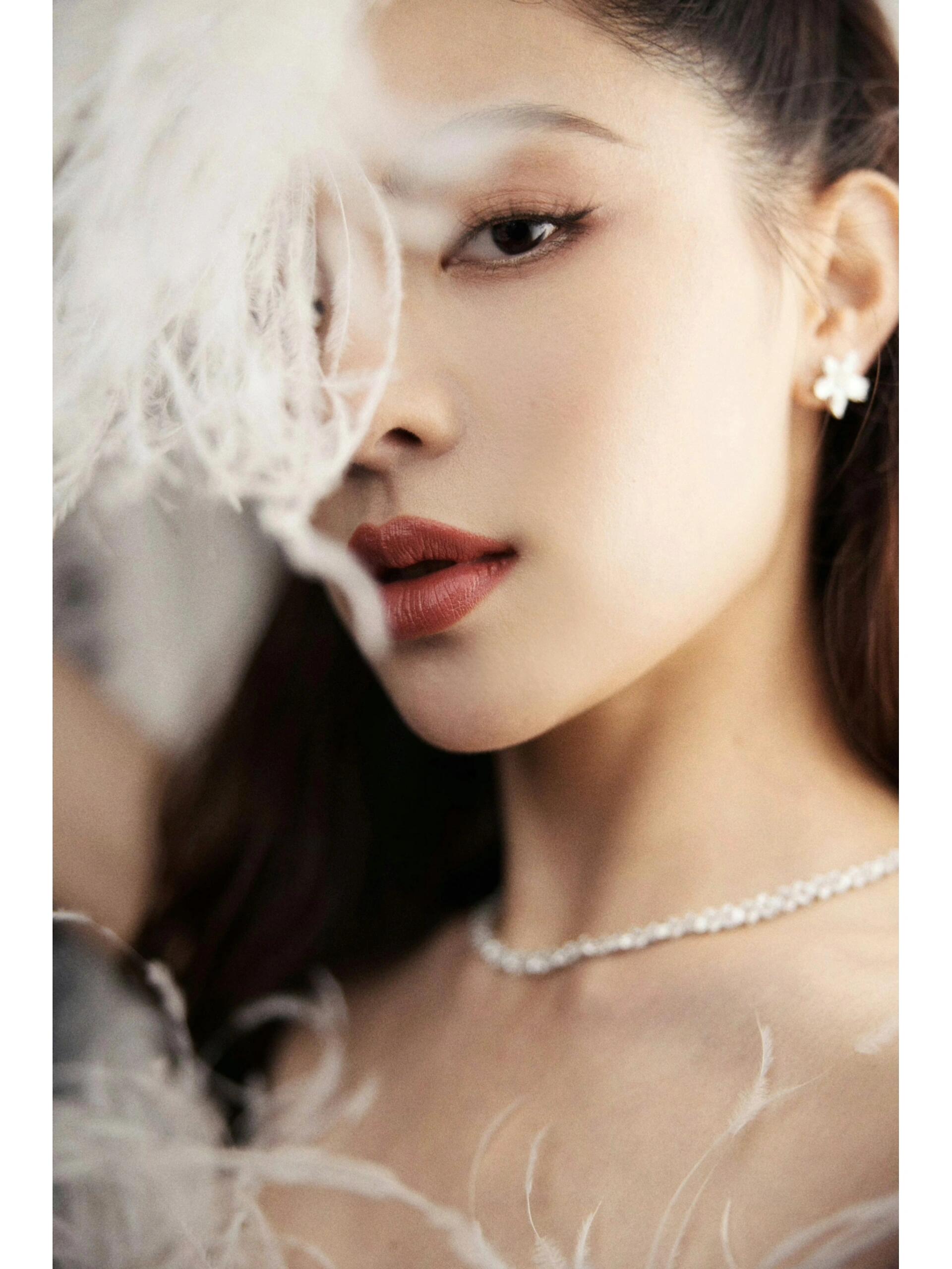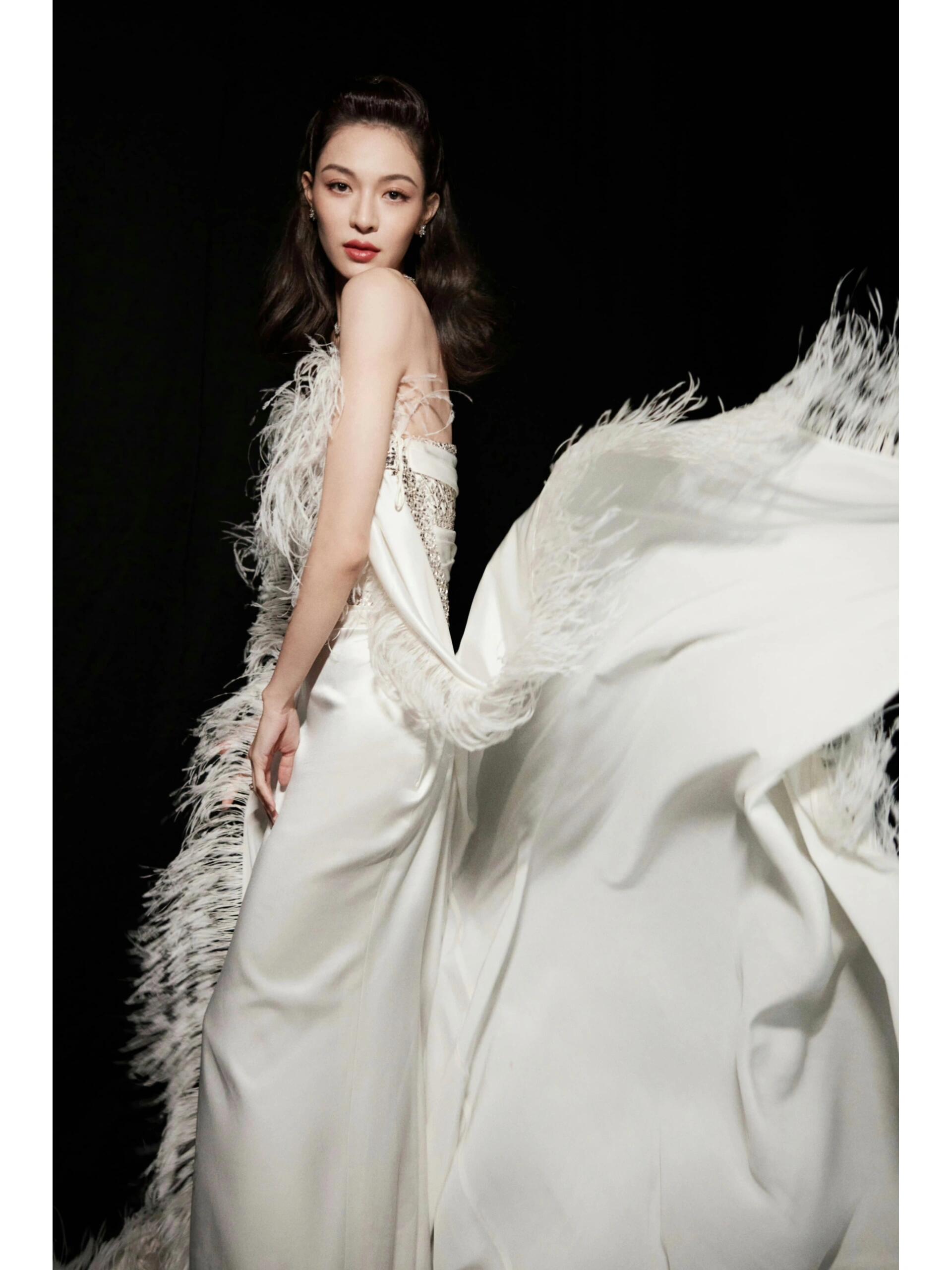 钟楚曦一袭雪纺丝缎礼服,轻盈羽毛披肩,佩戴着珠宝,很仙的一套look,很契合今晚演唱的歌曲“倩女幽魂”。