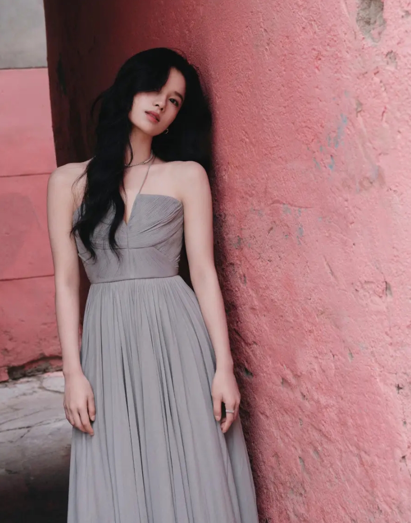 张婧仪灰色纱裙造型飘渺灵巧 漫步小巷似快乐精灵