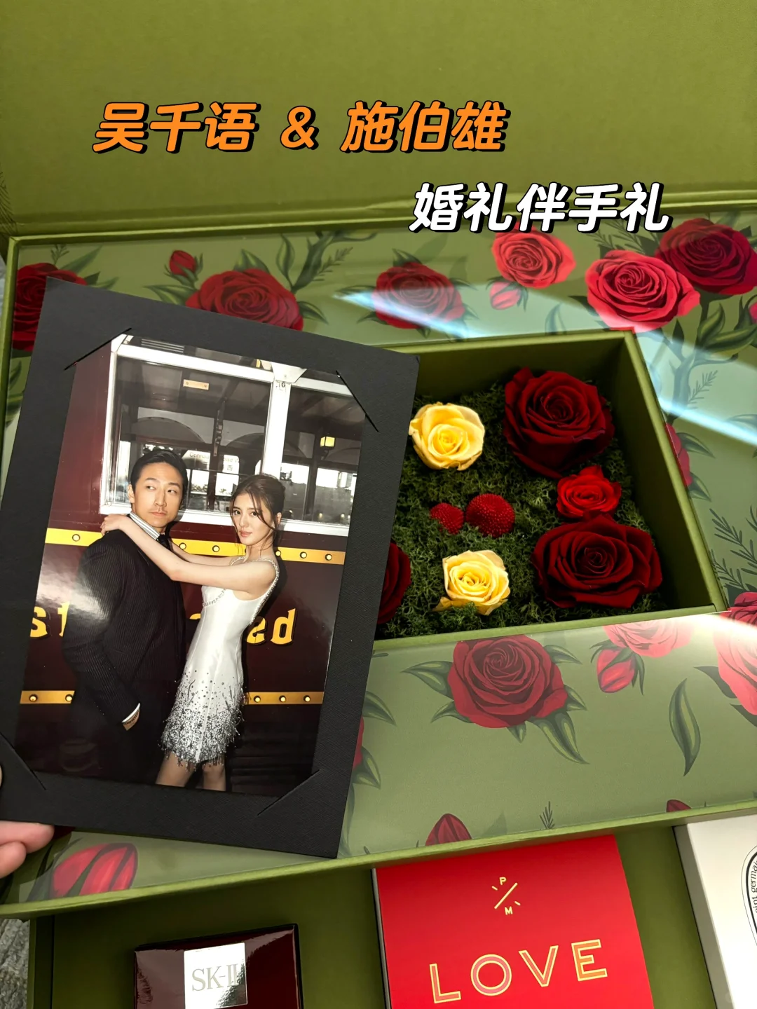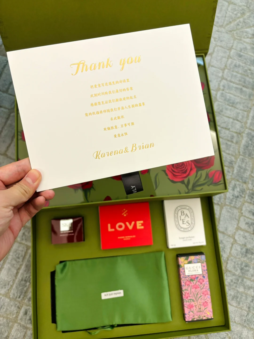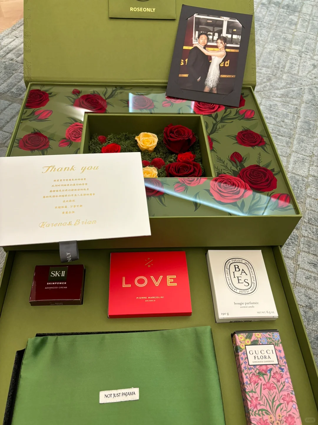 收到两位新人送来的婚礼伴手礼,让我来沾沾喜气!伴手礼很丰富,整体都围绕着花朵主题:Roseonly定制的永生花礼盒,里面还有SK-II的精华霜、diptyque的香氛蜡烛、PM家美味的巧克力、GUCCI的Floral香水和Not Just Pajama的真丝眼罩~祝愿这对璧人百年好合💑