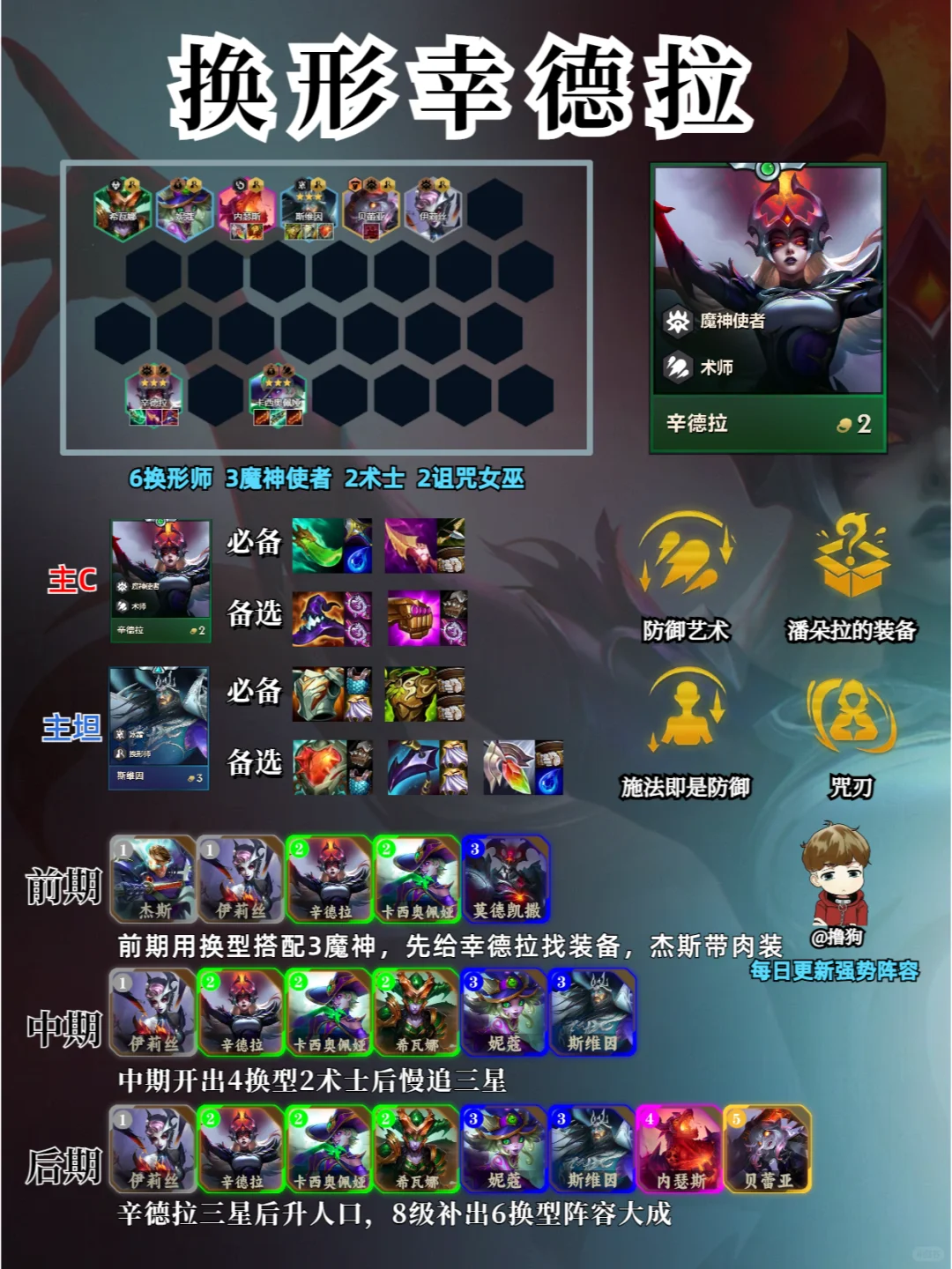❗阵容码进粉丝群 ①辛德拉的技能具有永久成长性,来的越早越好,做启动装可以增加成长的速度 ②阵容为辛德拉和卡西奥佩拉(蛇女)双C体系,蛇女如果数量多也一并三星后再上人口更好 ③前期也可以卖血拿辛德拉装备,阵容大棒需求多也可以做法爆。妮蔻和斯维因谁数量多谁带肉装追三星。