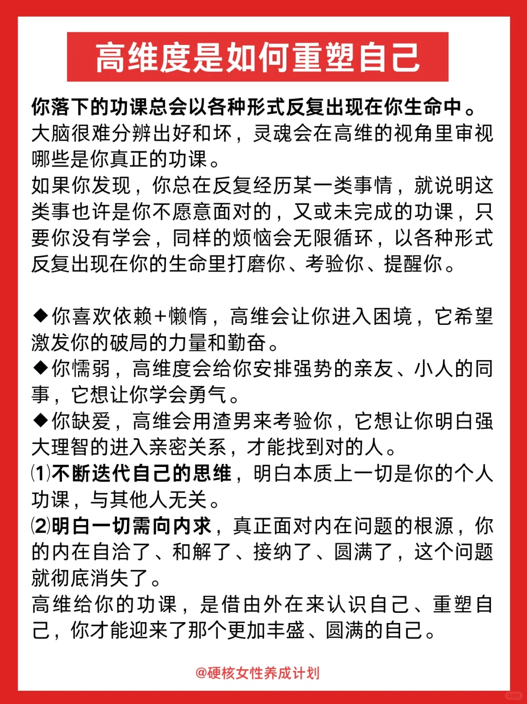 有些东西 就像你学生时代做的某篇阅读中的某个单词 你不去记忆 你就会害怕 越害怕 就越会来 所有你不去解决的东西 下一次就会解决你。 现阶段的不如意是过去局限思维的呈现;现在一切向内求,不断重塑自己的思想,重新养育和迭代认知,这个过程就逐渐圆满和丰盛,未来可期~