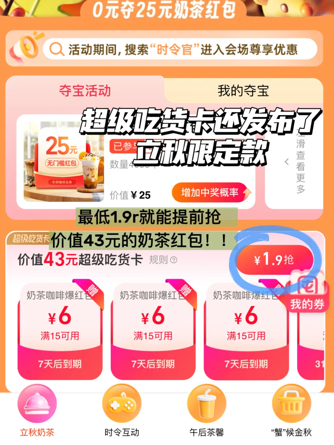 2.立秋限定发布超级吃货卡,咱可以最低花1.9元提前抢价值43元的奶茶红包~