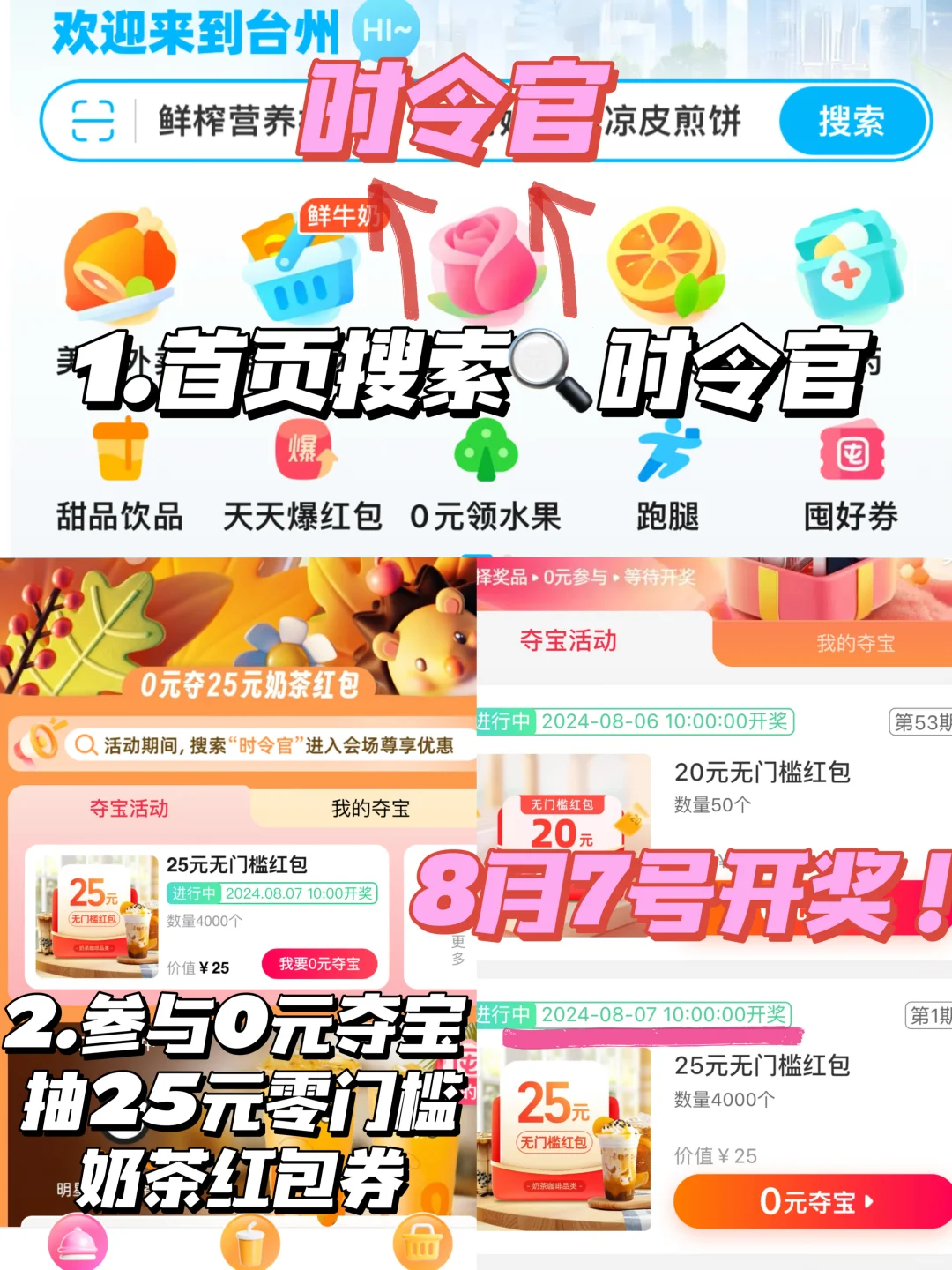 1.首页搜索🔍时令官,可以免费抽25元零门槛奶茶红包!8月7日上午十点准时开奖